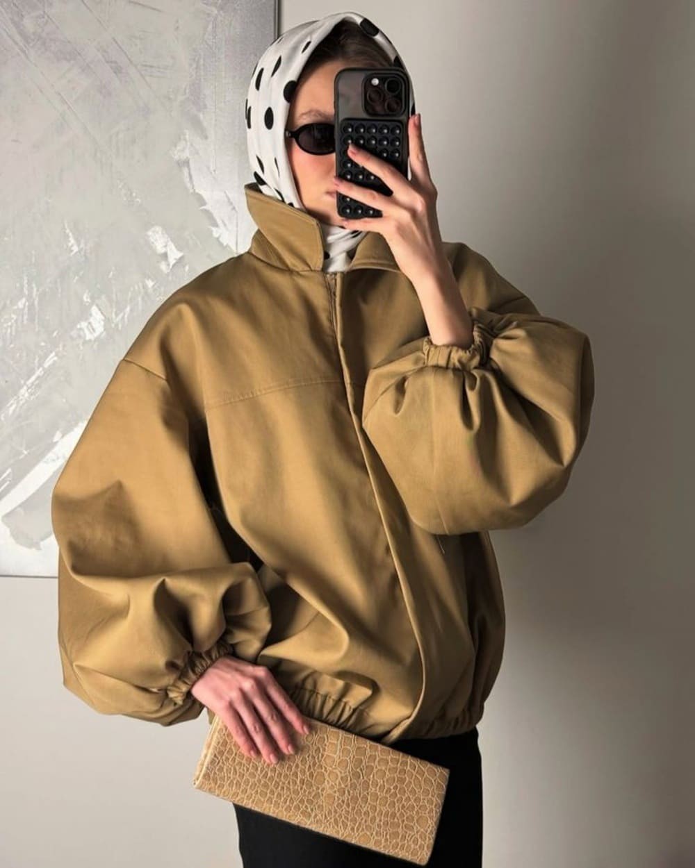 Tại London Fashion Week, các biên tập viên thời trang khoác áo cổ phễu màu xám tro, dựng cổ cao kết hợp boots da cao cổ – hình ảnh vừa cổ điển vừa hiện đại. Ở Seoul, các fashion influencer chọn phiên bản nylon dáng bomber, phối với váy dài sheer và phụ kiện bạc, mang lại cảm giác “tech-chic” – nữ tính mà vẫn có edge.