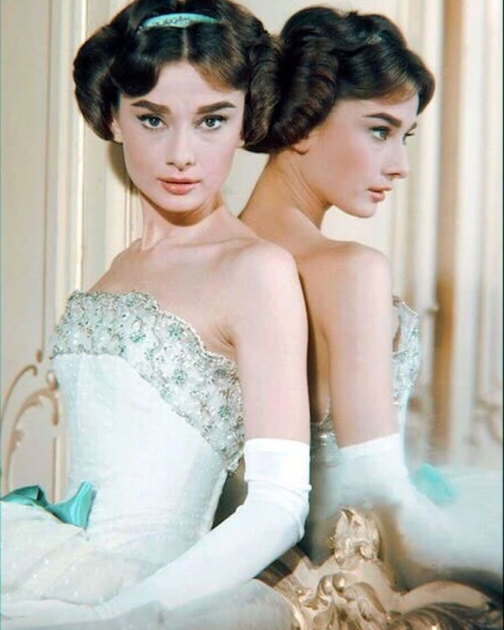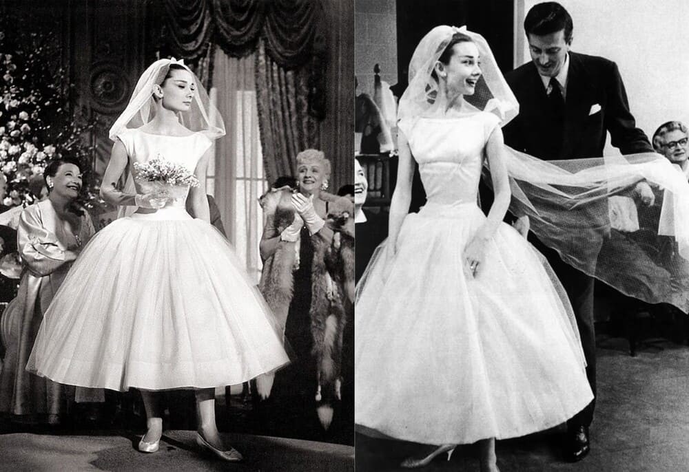 Từ Sabrina, họ bước sang Funny Face (1957) – nơi Audrey, trong chiếc váy đỏ taffeta quét sàn, xoay mình giữa khung cảnh Paris, khiến mỗi nếp gấp váy như hòa nhịp với tiếng shutter của nhiếp ảnh. Cũng trong phim ấy, chiếc váy cưới mini trắng dài ngang bắp chân, cổ thuyền, kết hợp voan đầu mảnh, đã định nghĩa lại khái niệm “cô dâu couture” – tinh tế, năng động, và thuần khiết theo cách rất Audrey.