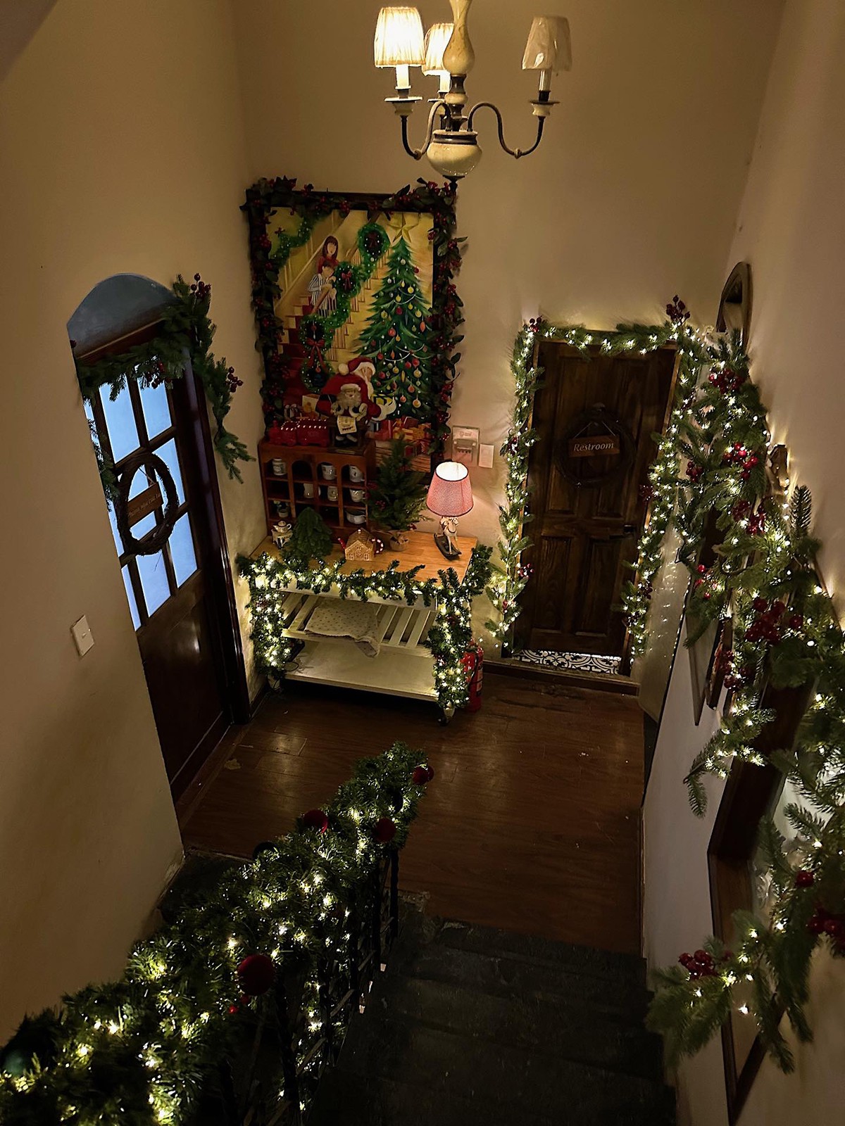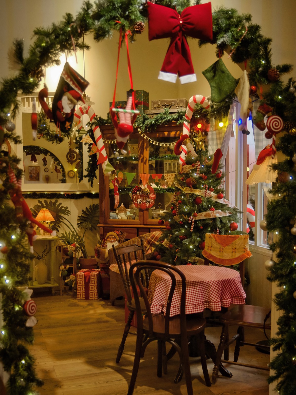 Khi đến quán, thực khách sẽ ngay lập tức bị thu hút bởi những chiếc nơ đỏ khổng lồ được treo dọc lối vào. Bên trong, quán tiếp tục gây ấn tượng với nhiều góc trang trí lấp lánh ánh đèn, trong đó cây thông lớn đặt ở vị trí trung tâm trở thành điểm nhấn thu hút mọi ánh nhìn. Đặc biệt, quán còn trưng bày nhiều vật dụng gợi nhớ mùa Giáng sinh như mô hình chú lính chì, những chú gấu bắc cực dễ thương hay những chiếc cốc hình ông già Noel, tạo nên không khí ấm áp và vui tươi cho bất kỳ ai ghé thăm.
