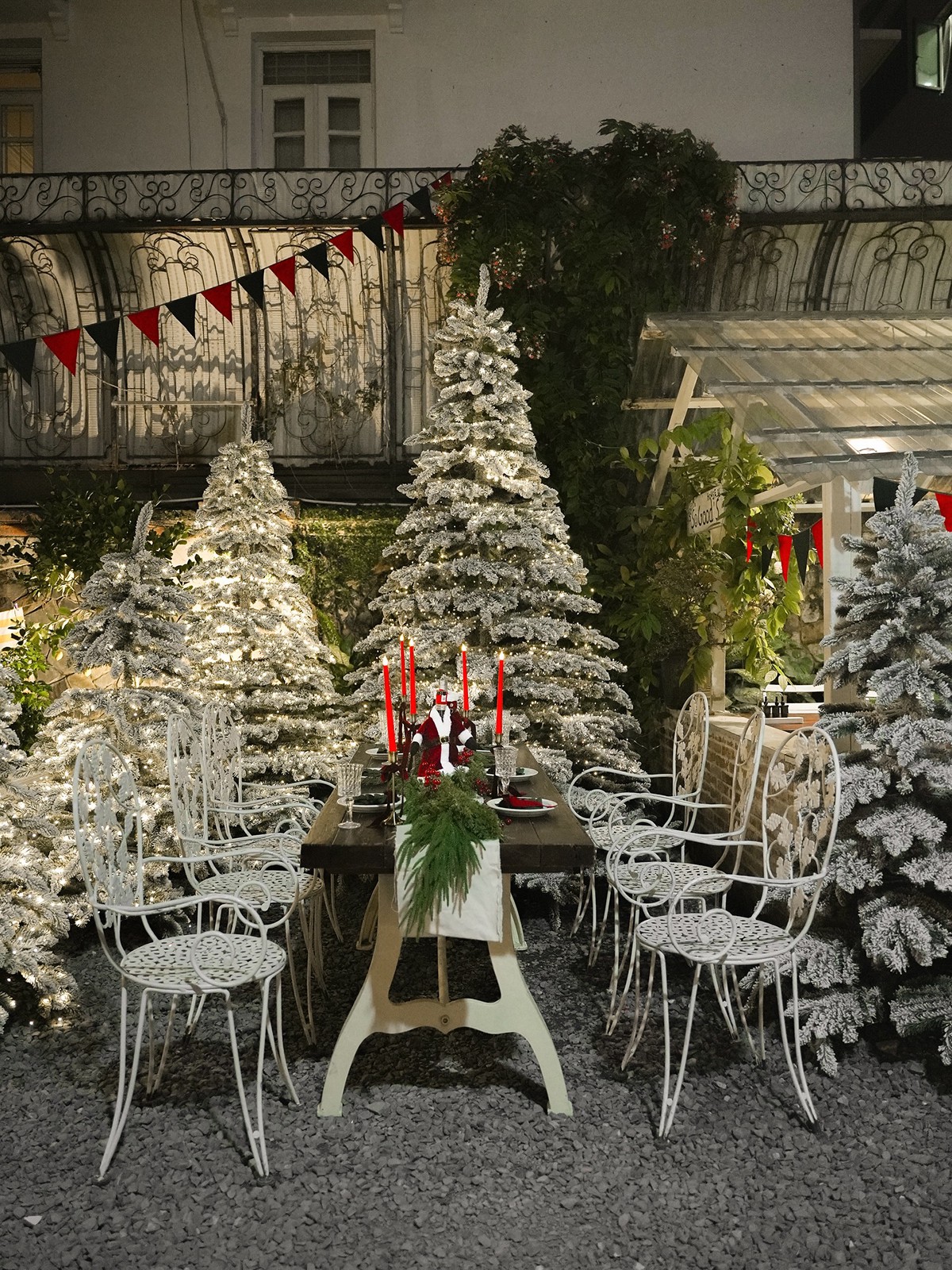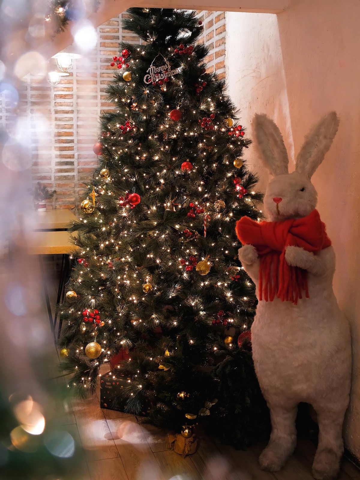 Oromia Coffee & Lounge là điểm đến quen thuộc của những tín đồ cà phê Sài Gòn nhờ không gian lãng mạn và thực đơn thức uống phong phú. Mùa Giáng sinh năm nay, quán cà phê tái hiện thế giới Wonderland thần tiên với những chú thỏ khổng lồ và các em cánh cụt xinh xắn. Ánh sáng vàng ấm len lỏi qua từng góc nhỏ, hòa quyện cùng mùi cà phê, hương quế và nến thơm, tạo nên cảm giác bình yên và gần gũi. Mỗi bàn và từng khung cửa đều được trang trí bằng những cành thông rực ấm và ánh kim, kể nên câu chuyện của một mùa lễ hội để không chỉ nhìn mà còn để cảm nhận.