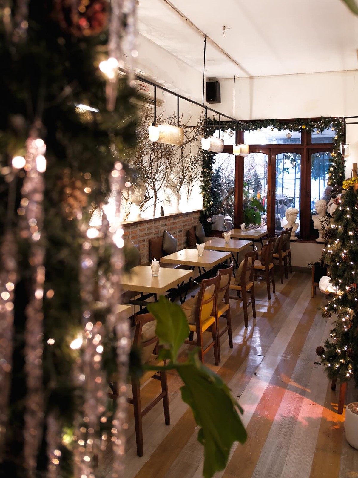 Nằm yên bình trong con hẻm nhỏ trên đường Đinh Công Tráng, quán cà phê Blue Dream Saigon vẫn giữ nguyên phong cách châu Âu xinh xắn đặc trưng. Khi bước vào tiệm, bạn sẽ dễ dàng cảm nhận không khí Giáng sinh đang đến gần qua những dây đèn lấp lánh, cây thông điểm quả châu đỏ và loạt phụ kiện trang trí mang hơi thở cổ điển. Tất cả gợi nhớ khung cảnh của những bộ phim Giáng sinh kinh điển, tạo nên cảm giác ấm cúng và gần gũi.