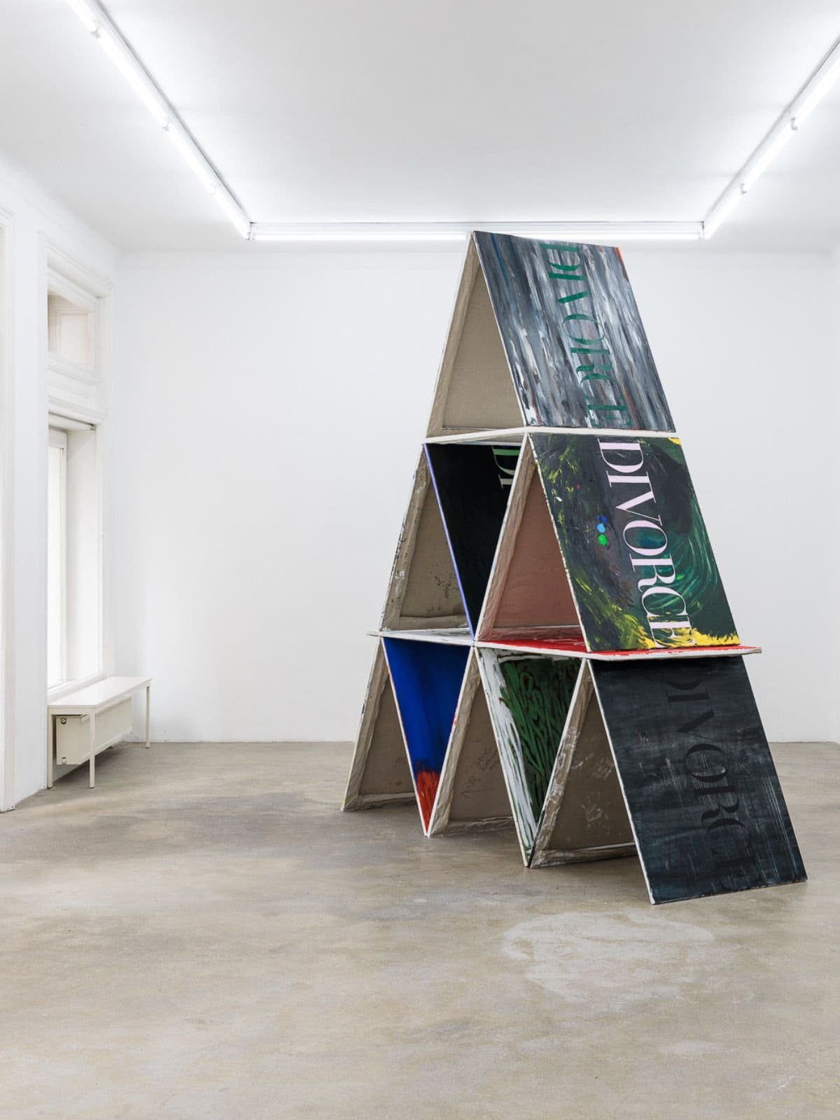 Đến với Frieze London 2025, Jasmine Gregory – nữ họa sĩ người Mỹ hiện sinh sống tại Zurich, đại diện cho phòng trưng bày Sophie Tappeiner (Áo) – mang đến một dấu ấn táo bạo khi xếp chồng những bức tranh sơn dầu mang dòng chữ “DIVORCE” (ly dị) thành một bộ bài khổng lồ.