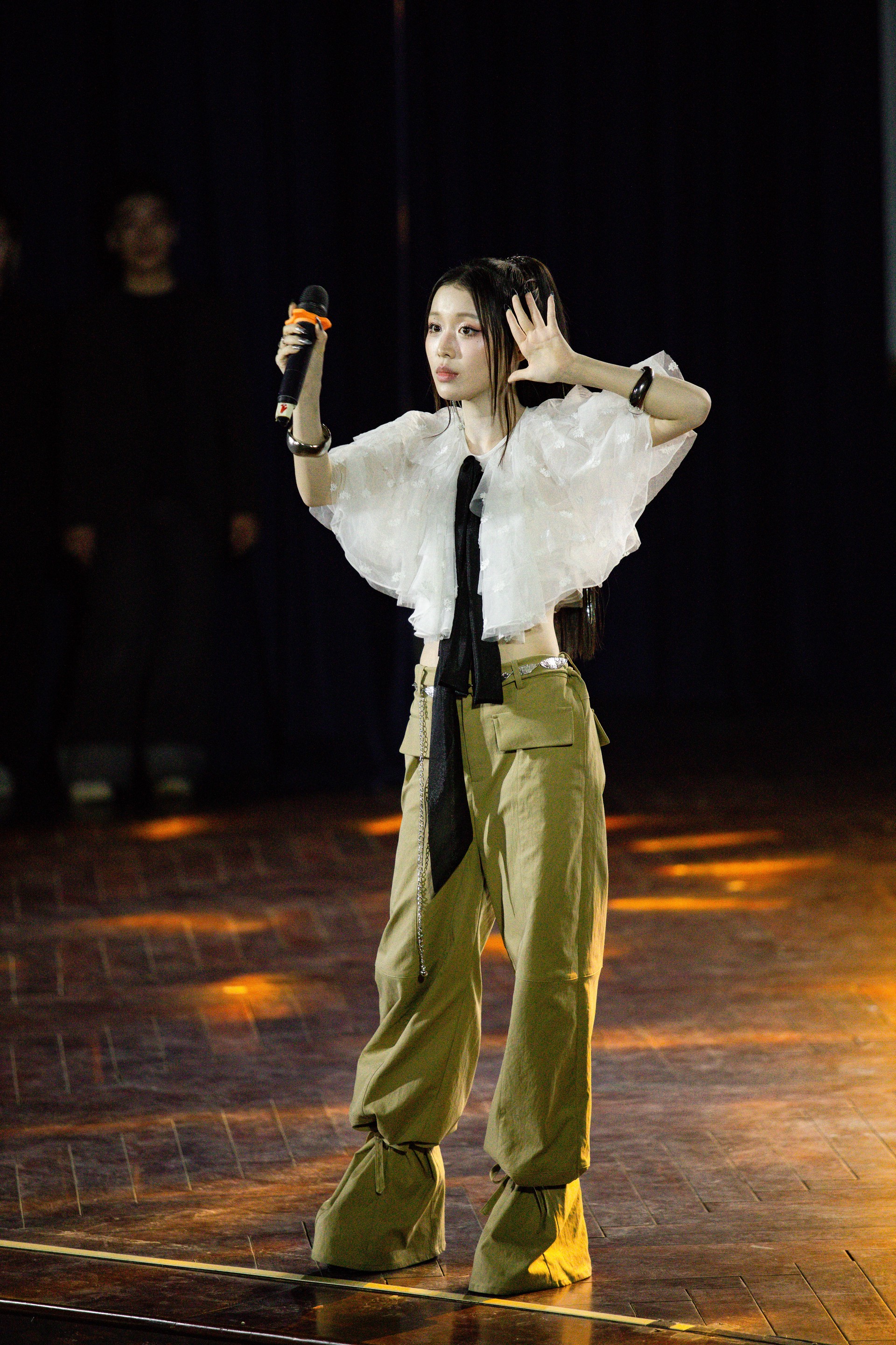 Trên sân khấu của buổi fanmeeting và cũng là tiệc sinh nhật sớm hôm 15/11 mừng Han Sara tuổi 25, sự xuất hiện nhẹ nhàng mà vẫn quyến rũ trong chiếc crop-top thiết kế bồng bềnh phối quần baggy năng động, buộc túm gầu quần đầy phá cách.