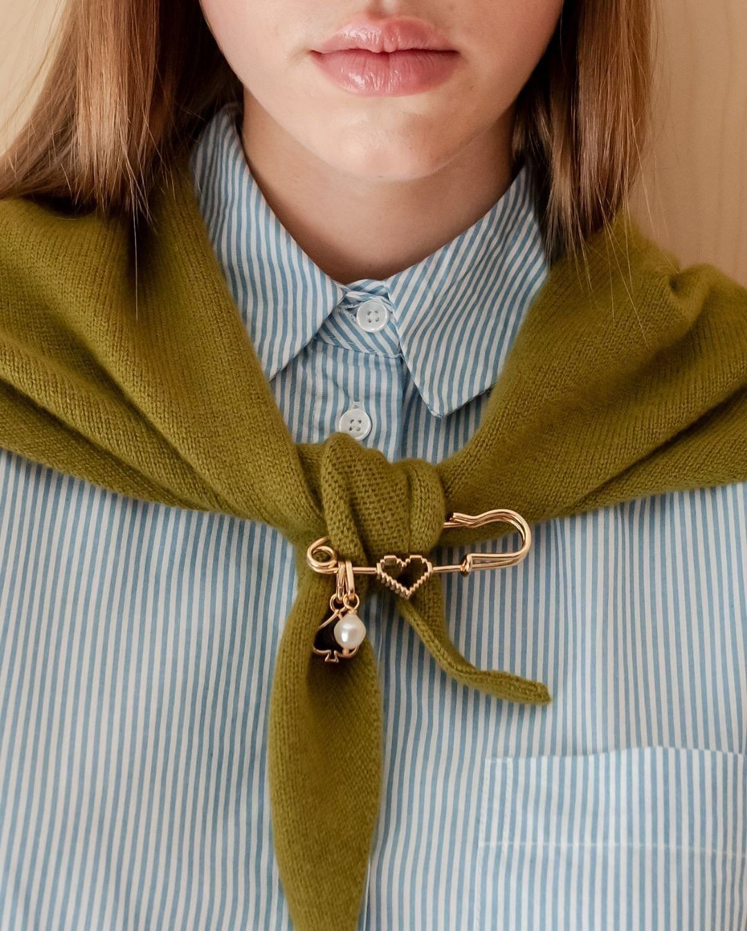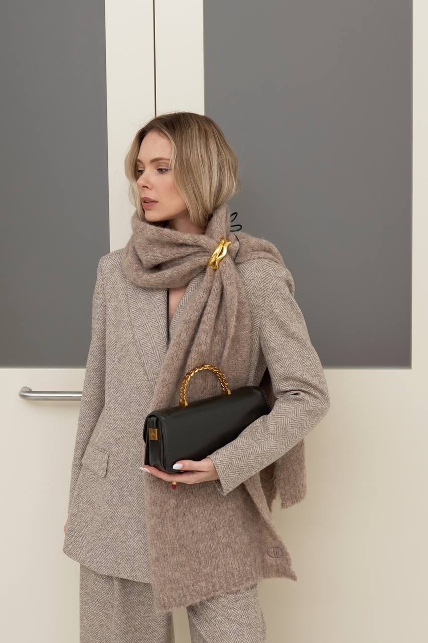 Một trong những cách mới mẻ nhất để làm nổi bật chiếc khăn len mùa lạnh chính là cố định nó bằng brooch hoặc khoen cài kim loại. Chỉ cần quàng khăn hờ quanh cổ hoặc vai, sau đó dùng một chiếc brooch vàng nhỏ để ghim hai lớp khăn lại với nhau, tổng thể lập tức trở nên sang trọng và có chủ đích hơn. Cách cài này không chỉ giữ khăn đúng vị trí mà còn tạo nên hiệu ứng “điêu khắc” ở phần ngực và vai: mềm từ chất liệu len, nhưng sắc nét từ ánh kim loại. Kiểu cài này đặc biệt phù hợp với áo khoác dạ hoặc suit dáng rộng, nơi chiếc brooch sẽ đóng vai trò như điểm sáng trang sức nhưng không hề phô trương.