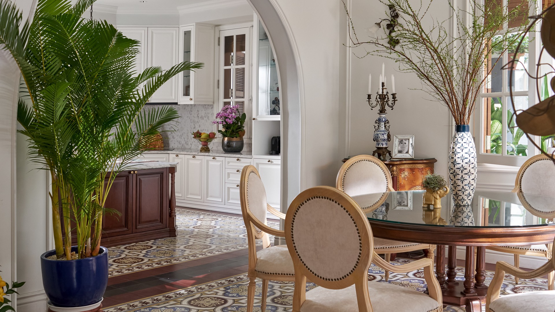 Giữa không gian đậm tính duy mỹ từ kiến trúc Pháp, đời sống phong phú của chủ nhà được hé lộ qua những tiểu tiết nằm sau lớp kính của kệ tủ. Đó là những chiếc đèn, tượng gốm và vật phẩm mang về sau những chuyến đi, là khung ảnh gia đình nhỏ nhắn đặt trên chiếc tủ buffet, bình hoa tươi và gốm sứ được đặt để với nhiều cân nhắc. Mỗi món đồ dường như được tính toán vị trí phù hợp cho riêng mình.