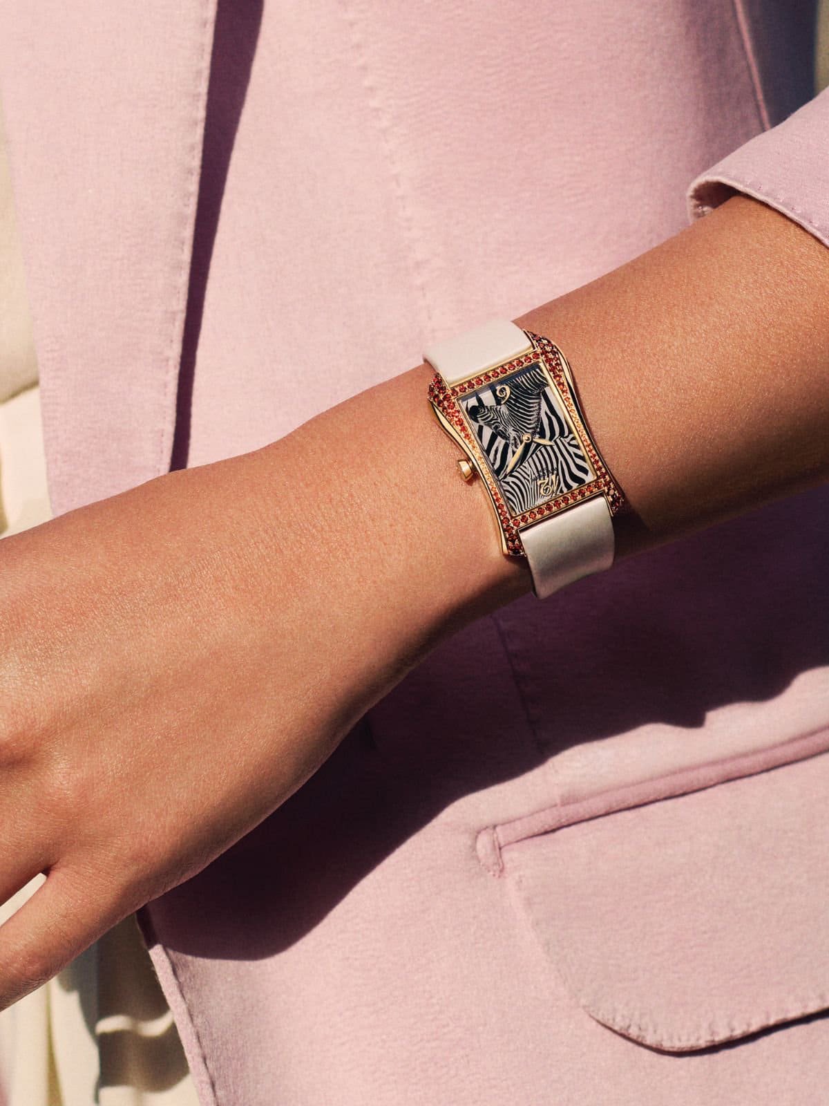 Họa tiết ngựa vằn sau đó được hoàn thiện bằng kỹ thuật mạ kim loại màu đen và phủ sơn trắng ở mặt số sapphire, tạo nên hiệu ứng thị giác ba chiều sống động như thể từng đường vân đang chuyển động dưới ánh sáng. Những đường vân ấy gợi cảm giác phóng khoáng nhưng vẫn giữ được nét mềm mại như chính tinh thần người phụ nữ hiện đại mà thương hiệu hướng đến: bản lĩnh, tự do nhưng vẫn đầy duyên dáng.