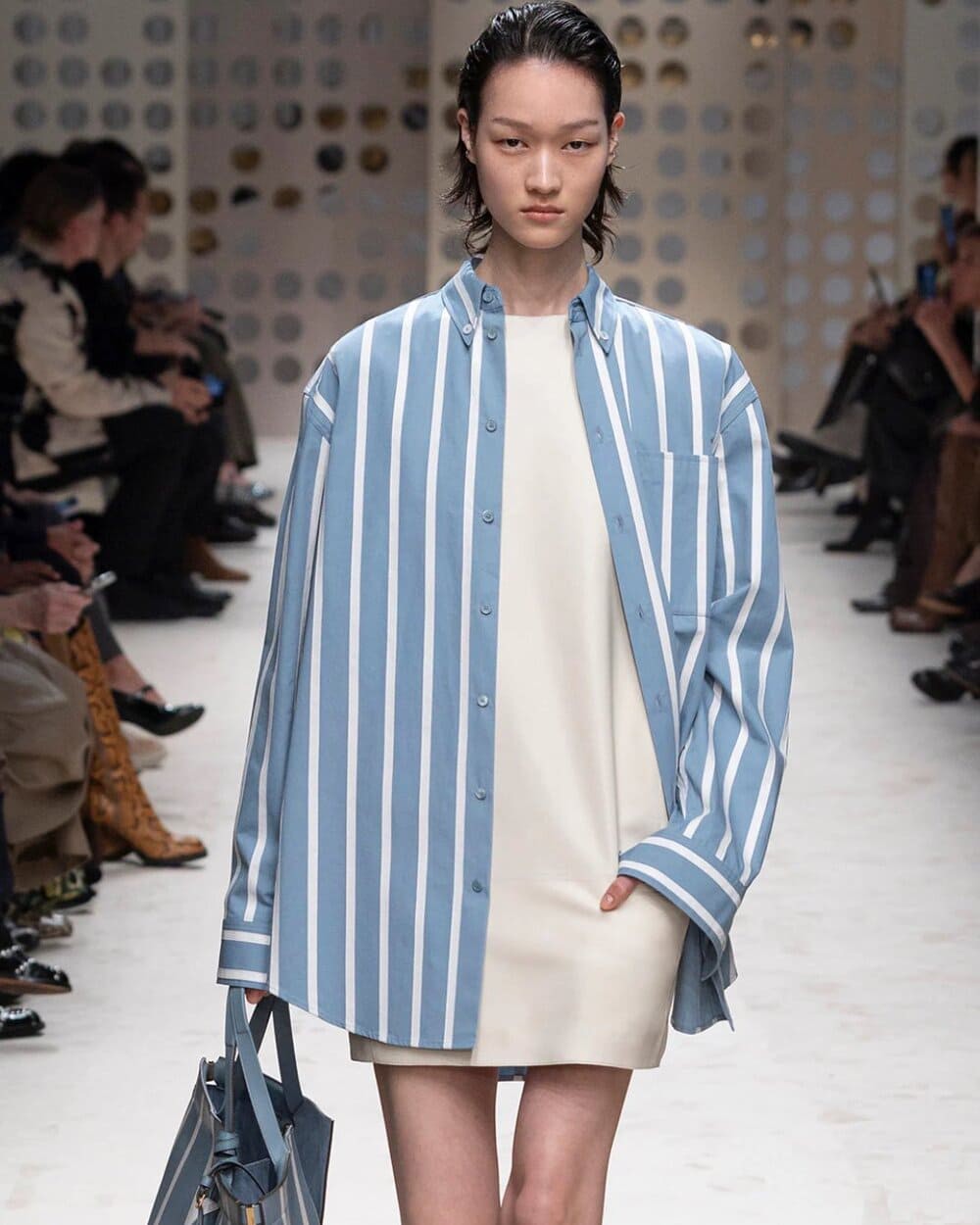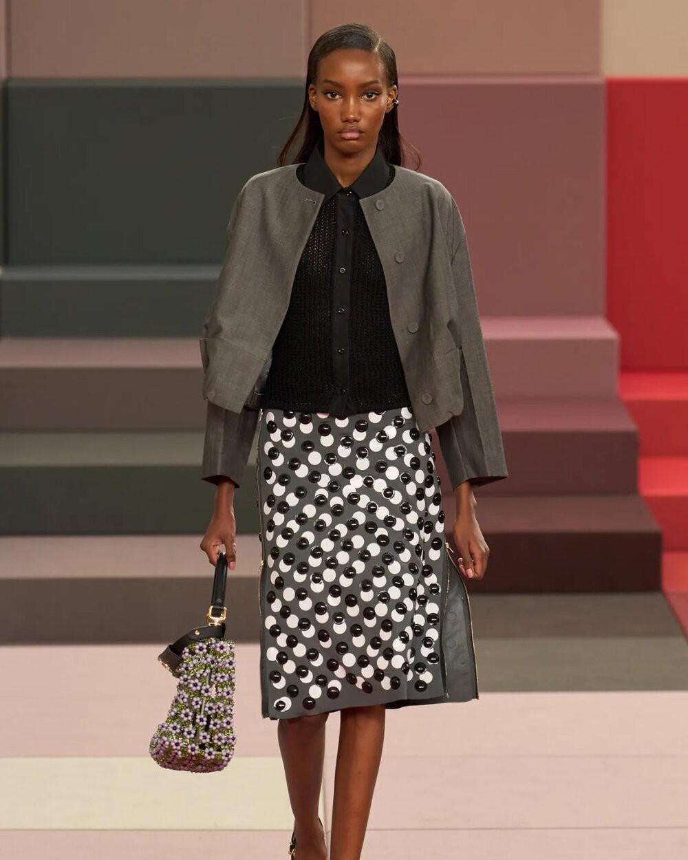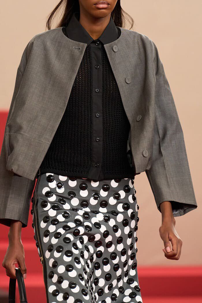 Cũng trong BST lần này của Fendi, áo khoác không cổ đậm chất Jackie Kennedy được kết hợp với chân váy chấm bi đính hạt trong suốt, cho thấy sự tài tình của nhà mốt trong cách diễn tả nét cổ điển kết hợp cùng yếu tố đương đại.