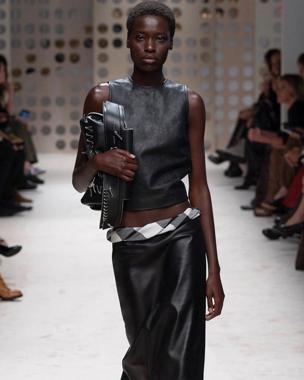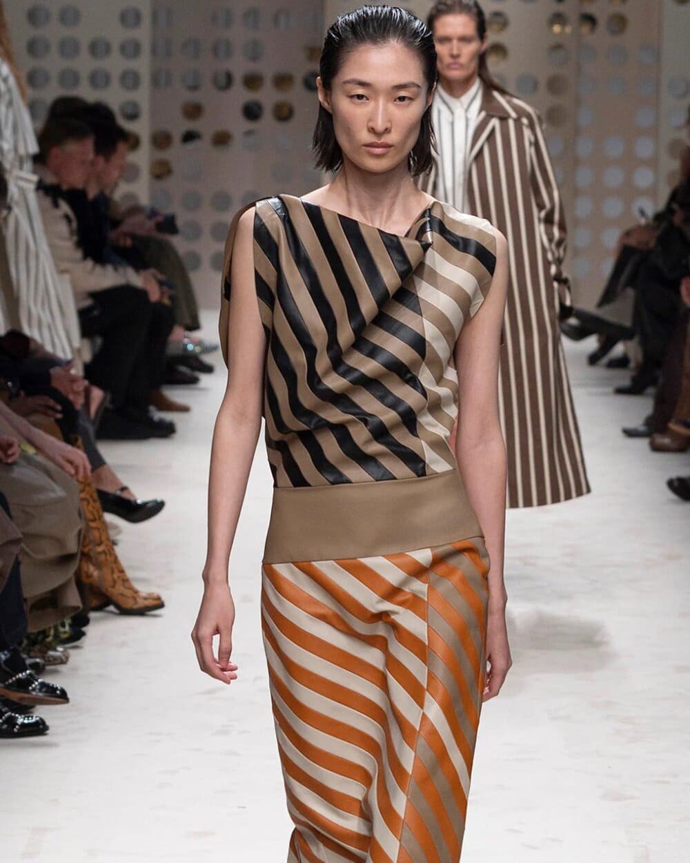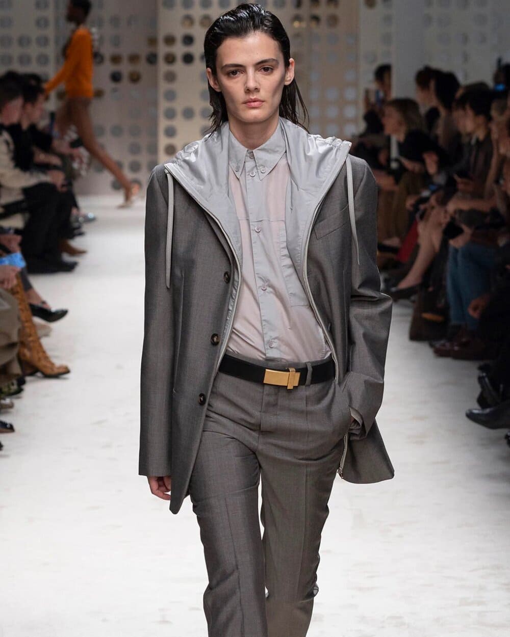 Cũng trong BST lần này của Fendi, áo khoác không cổ đậm chất Jackie Kennedy được kết hợp với chân váy chấm bi đính hạt trong suốt, cho thấy sự tài tình của nhà mốt trong cách diễn tả nét cổ điển kết hợp cùng yếu tố đương đại.