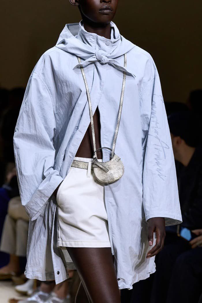 Cách những người mẫu của Emporio Armani mặc chúng theo nhiều lớp cũng rất đáng chú ý. Có chiếc được may theo phom dáng dài, buộc khăn choàng quanh cổ, bên trong cài nửa nút phần trên và để hở phía dưới, phối cùng quần short ngắn kiểu bãi biển.