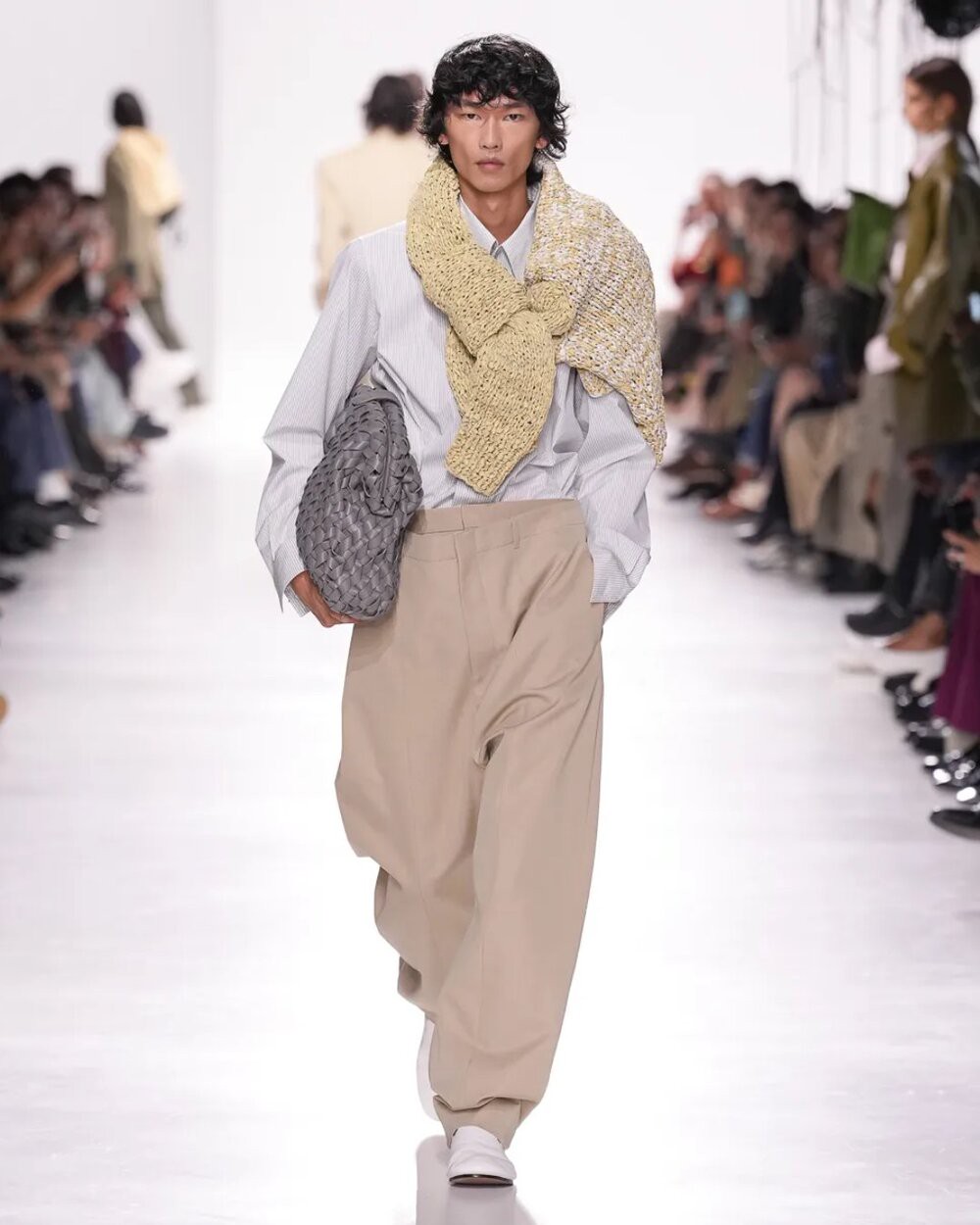 Ngoài ra, áo sweater quàng vai và thắt hờ trước cổ trong BST của nhà mốt Bottega Veneta, quần dài sọc dọc trong BST Dolce & Gabbana, hay áo sơ mi sọc oxford, áo polo với phối màu bất thường từ nhiều nhà mốt khác trong sàn diễn Xuân Hè 2026 cũng đều là những dấu hiệu cho thấy trào lưu preppy không chỉ là chi tiết riêng lẻ mà đang trở thành motif lặp lại liên tục trong suốt đời sống thời trang giai đoạn sắp tới.