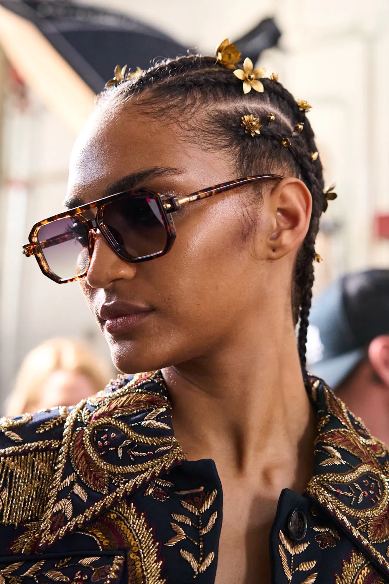Với những kiểu tóc có cấu trúc như tóc tết cornrows, tóc thắt bím hoặc tóc xoăn tự nhiên, kẹp hoa kim loại nhỏ trở thành phép màu tạo chiều sâu. Khi gài rải rác theo nhịp hoặc theo đường xoắn của tóc tết, kẹp không chỉ bắt sáng mà còn tạo layer ánh sáng như những chấm phá nghệ thuật nằm giữa các lọn tóc. Sắc vàng kim loại đặt cạnh nền tóc trầm giúp tăng độ tương phản, khiến mái tóc trở nên sống động dưới ánh đèn – điều rất phù hợp với không khí đêm tiệc và những buổi gặp gỡ cuối năm. Đây cũng là kỹ thuật được nhiều stylist tóc sử dụng trong các chiến dịch làm đẹp, nơi mái tóc cần vừa tự nhiên vừa có điểm nhấn tinh tế nhưng vẫn giữ được tính ứng dụng.