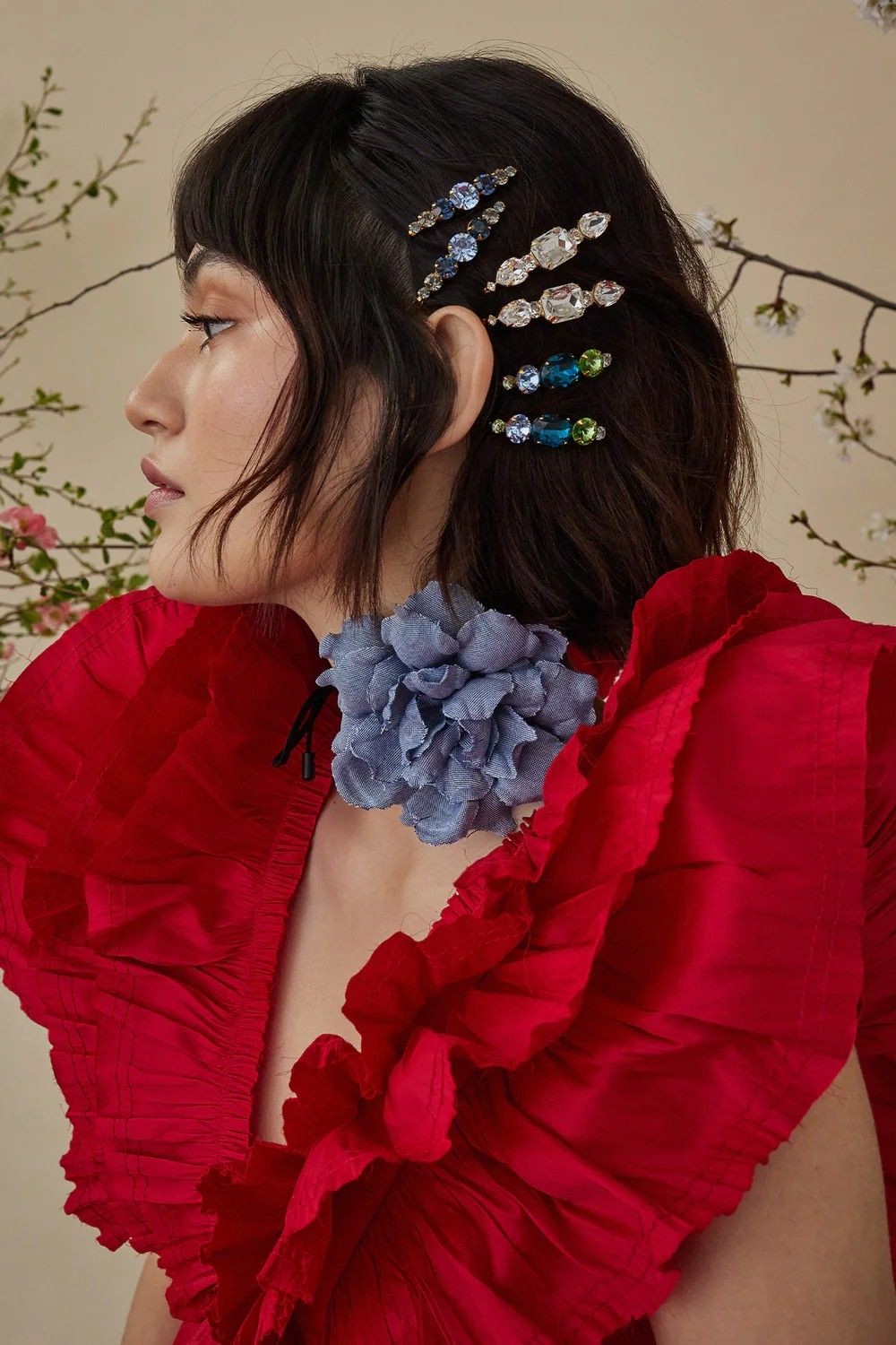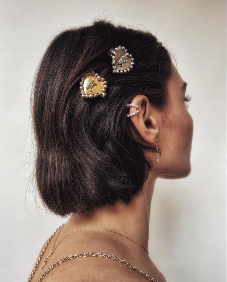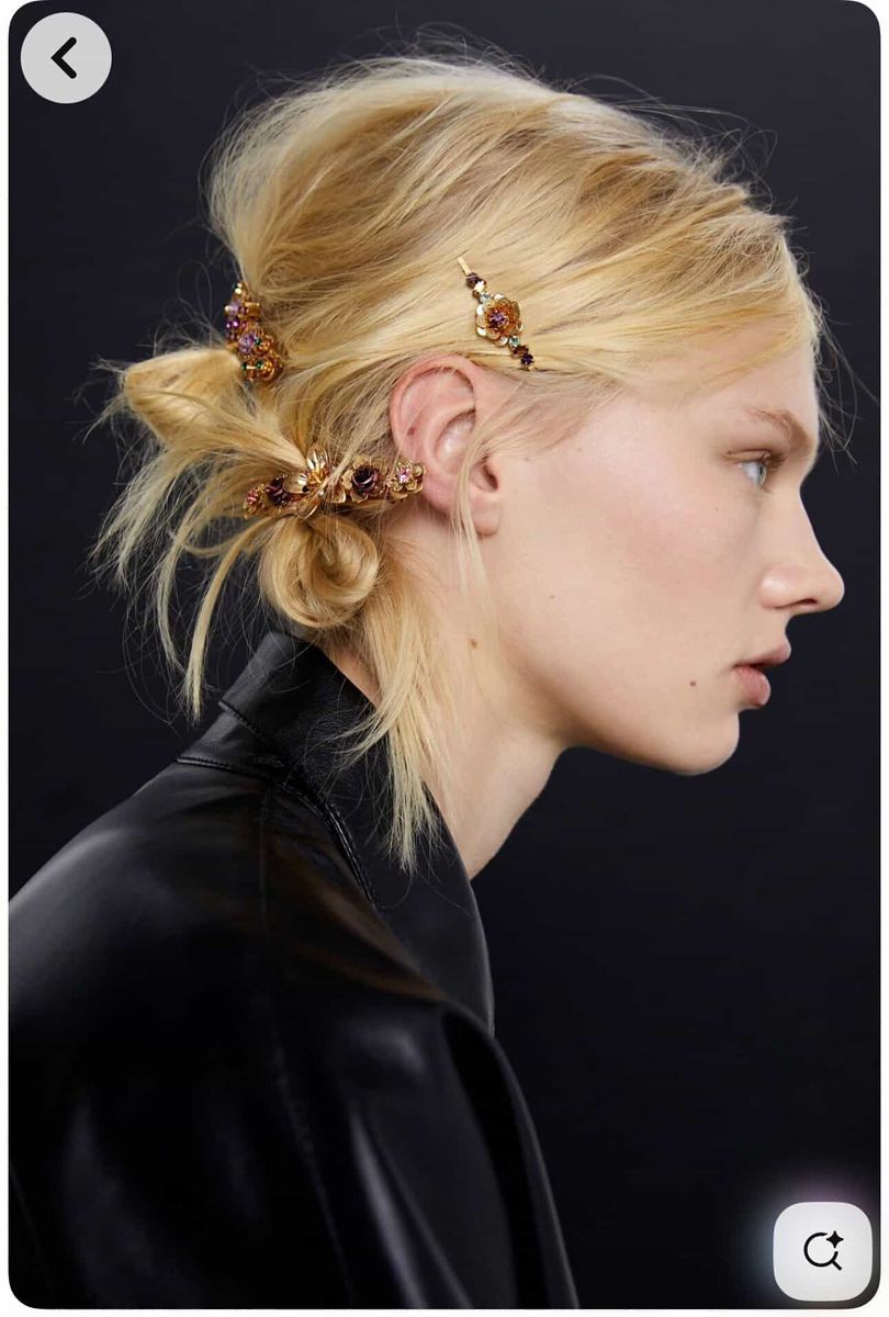 Decorative snap clips mùa lễ hội năm nay theo tinh thần runway: xếp thành cụm dọc thái dương để tạo một “mảng sáng” trên tóc. Từ kim loại vàng, bạc đến đá màu cắt giác, những chiếc kẹp nhỏ được layer cạnh nhau làm mái tóc trở nên sắc nét và giàu chiều sâu, giống như đang đeo một chuỗi trang sức mini ngay trên tóc. Dù đi cùng tóc bob hay tóc dài, hiệu ứng luôn rõ rệt: mỗi lần nghiêng đầu, ánh sáng phản chiếu qua từng mặt đá khiến tổng thể trông sang và có chủ đích. Đây là kiểu phụ kiện dễ dùng nhưng tạo điểm nhấn mạnh, chỉ cần vài chiếc kẹp xếp thẳng hoặc xiên là đủ để mái tóc có ngay thần thái “editorial” đúng tinh thần lễ hội.