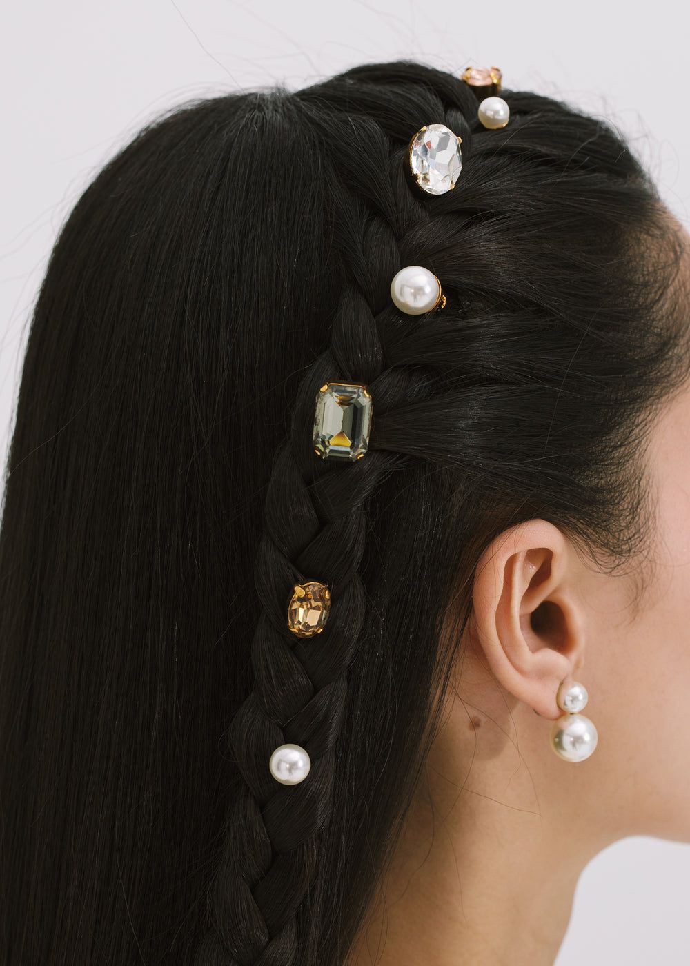 Không thể bỏ qua ngọc trai khi ta cần sự cổ điển thanh lịch nhưng vẫn lấp lánh cho mùa lễ. Khi gài dọc một bên tóc hoặc đặt thành cụm nhỏ quanh chân búi thấp, ngọc trai tạo hiệu ứng phản chiếu nhẹ, giúp đường nét gương mặt sáng và mềm hơn dưới ánh đèn. Trên nền tóc nâu hoặc đen, độ tương phản giữa bề mặt bóng của ngọc trai và chất tóc tạo nên cảm giác trang nhã, phù hợp cả tiệc tối lẫn những buổi gặp thân mật. Nhờ form snap gọn và chắc, phụ kiện này giữ tóc đúng nếp nhưng vẫn đem lại chiều sâu thị giác, một kiểu sang trọng vừa đủ, không “làm quá” nhưng luôn hiệu quả.