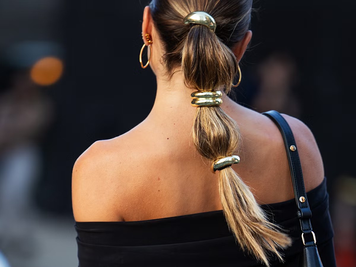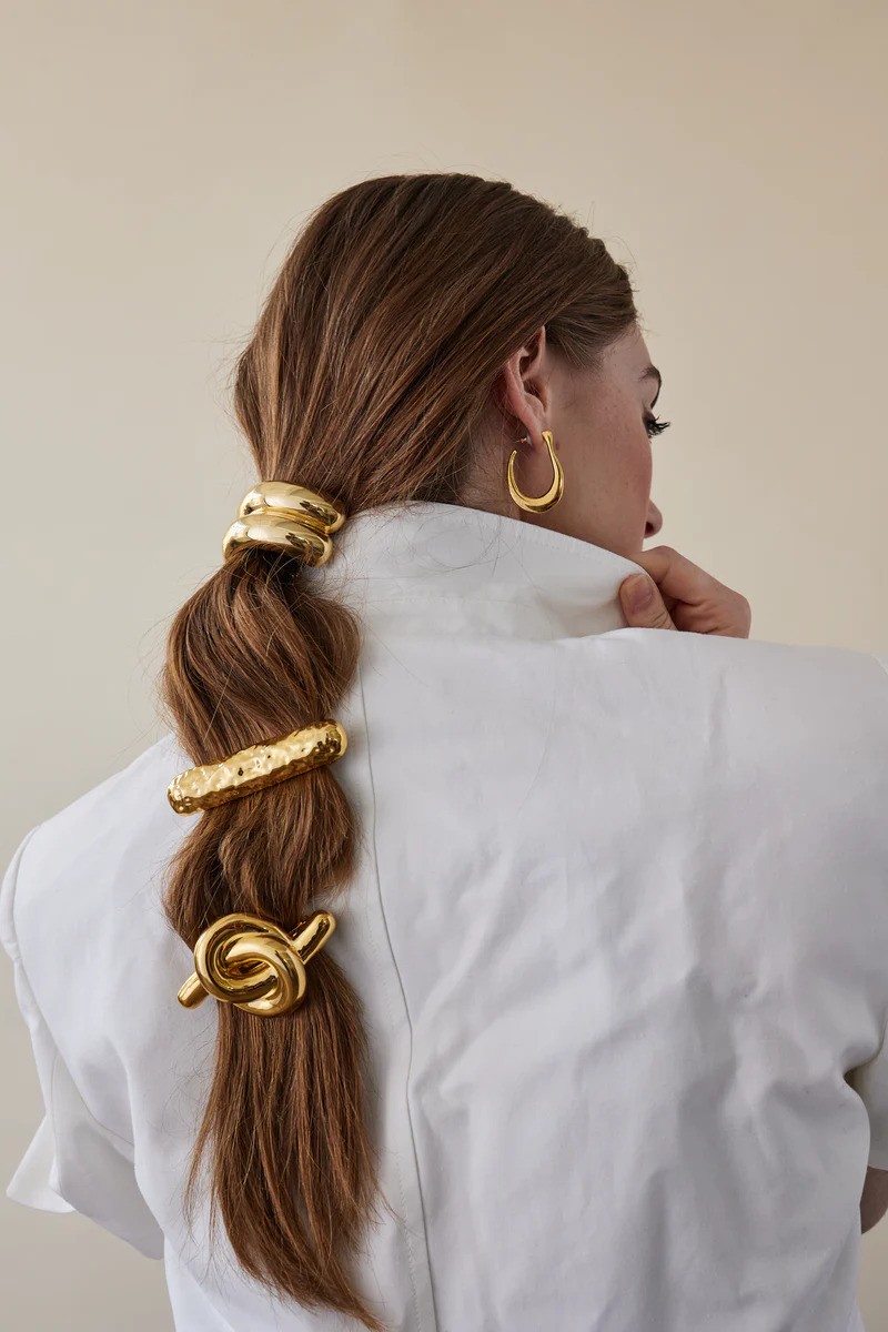 Ponytail cuff là món phụ kiện nhỏ nhưng có khả năng nâng cấp kiểu tóc nhanh chóng đến mức ấn tượng. Nó mang tinh thần tối giản của kim loại bóng, tạo cảm giác sang trọng ngay khi vừa chạm vào chân tóc. Khác với dây chun hay kẹp thông thường, cuff không che tóc mà để tóc quấn xung quanh, tạo hiệu ứng phồng rối rất “đắt”, không phải thiếu chăm chút. Tóc búi buộc lơi (messy bun) khi kết hợp cuff có thể trở thành kiểu tóc tiệc tối chỉ trong 30 giây. Với tóc đuôi ngựa ép bóng, cuff lại tạo cảm giác hiện đại, sạch sẽ và đầy quyền lực.