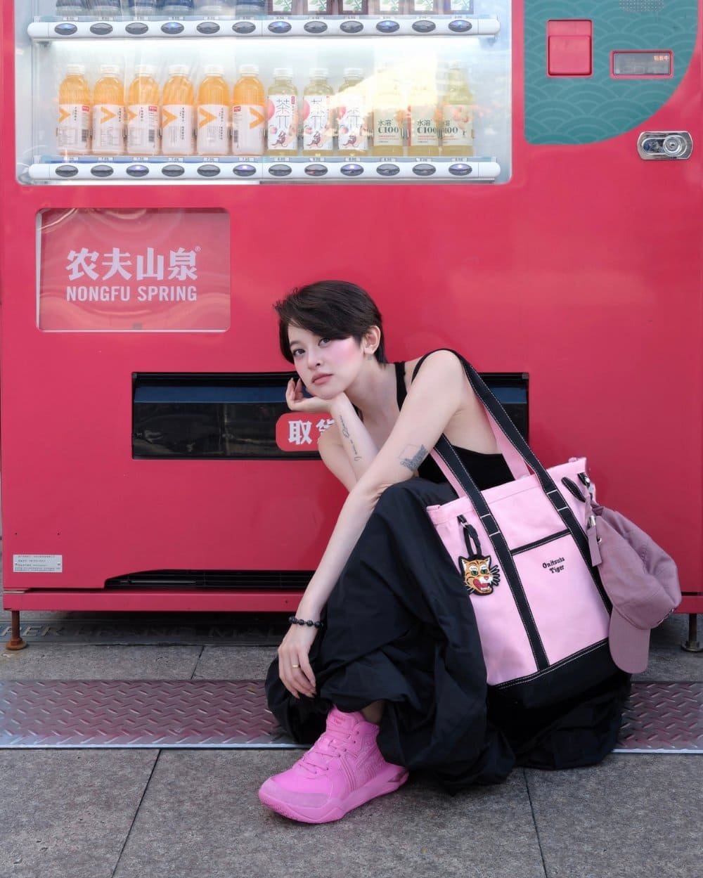 Sun HT giữ nguyên tinh thần đường phố: track jacket đen–tím, túi chéo đồng tông, và đôi sneaker buộc dây trong quán cà phê. Không cần pose, chỉ một động tác nhỏ cũng đủ lột tả urban cool – thứ cá tính tự nhiên mà Onitsuka Tiger luôn tôn vinh.