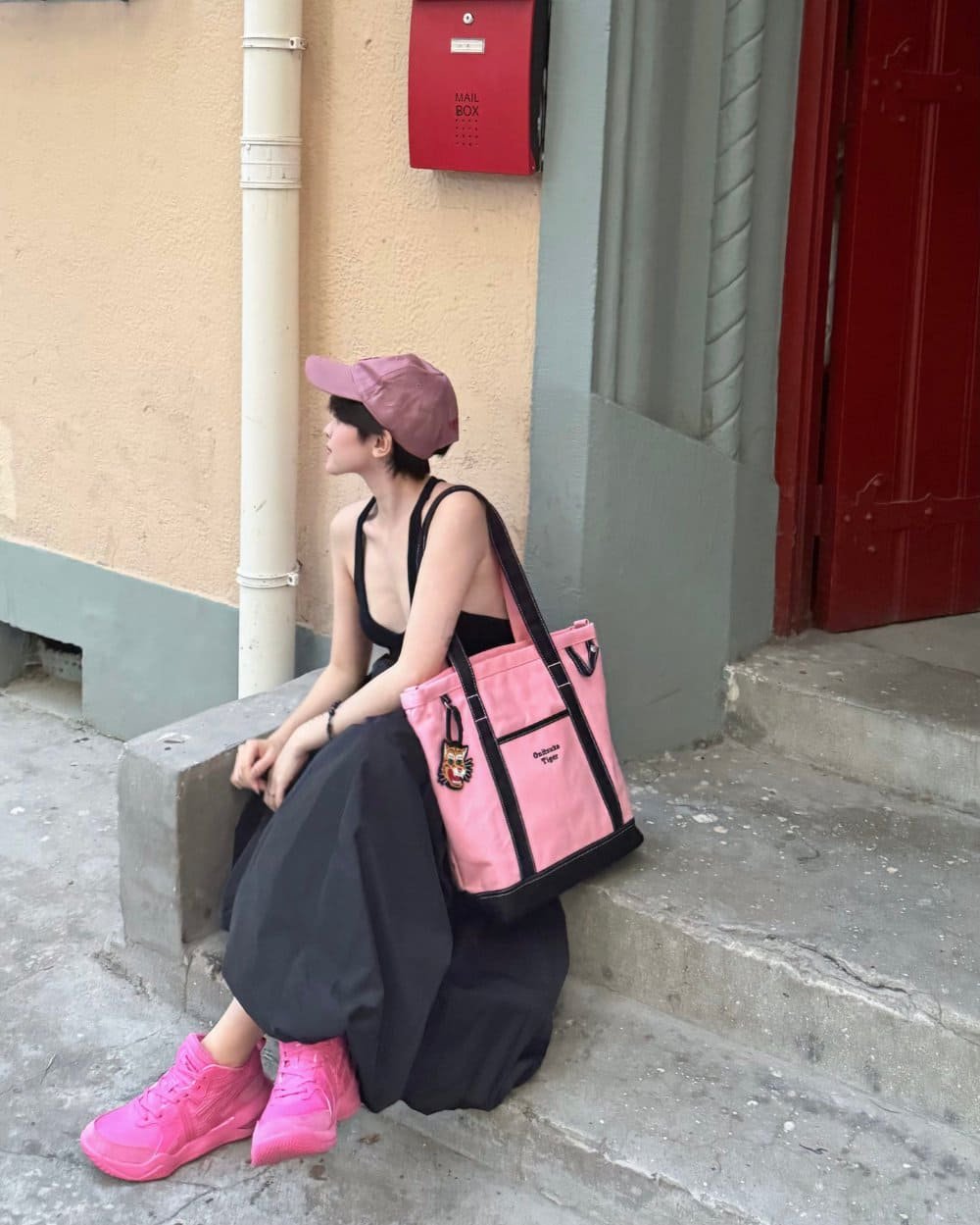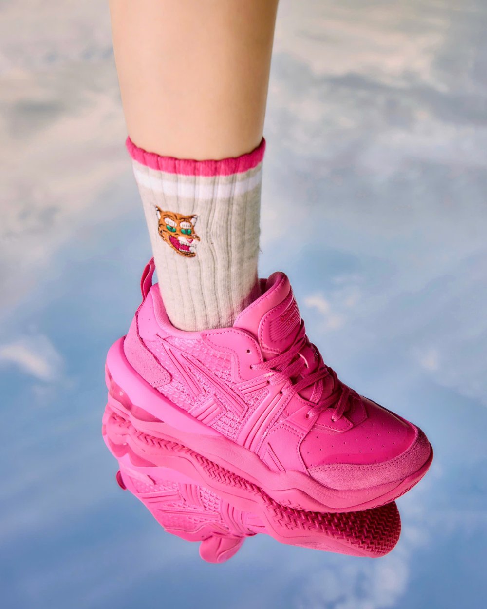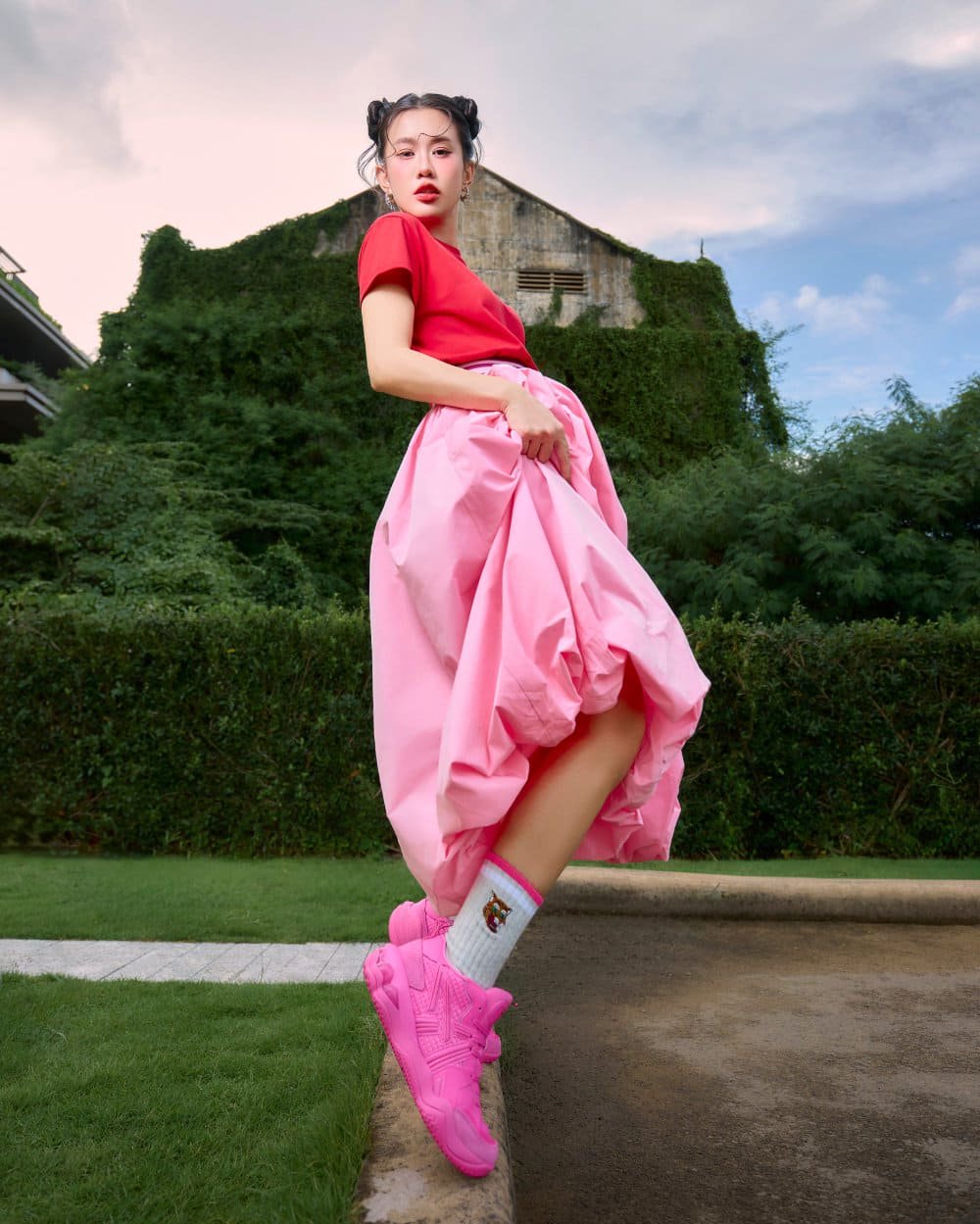 Ngọc Thảo chọn bản phối hồng–đỏ rực rỡ giữa mảng xanh thành phố: tươi trẻ, ngọt ngào nhưng chẳng hề dễ đoán. Đôi sneaker hồng biến cô thành biểu tượng của sự nổi loạn dịu dàng – nơi nữ tính và năng lượng cùng tồn tại.