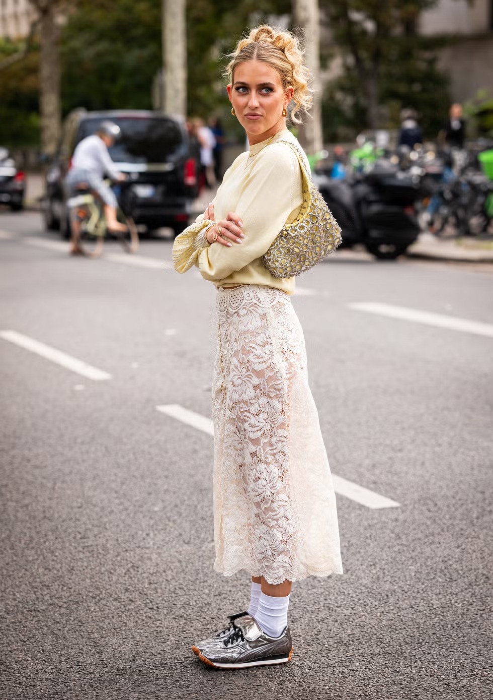 Phối tất cùng giày tưởng như một chi tiết nhỏ nhưng lại tạo ra sự thay đổi lớn về phong thái. Một đôi tất mỏng đi cùng slingback mang lại sự nữ tính cổ điển, mang tinh thần nerdy chic mang cảm hứng Miu Miu; tất dày đi với mule mang đến vẻ ấm cúng; tất cổ cao đi cùng loafer khiến outfit nhẹ nhàng nhưng vẫn cá tính theo kiểu “nghịch ngầm”.