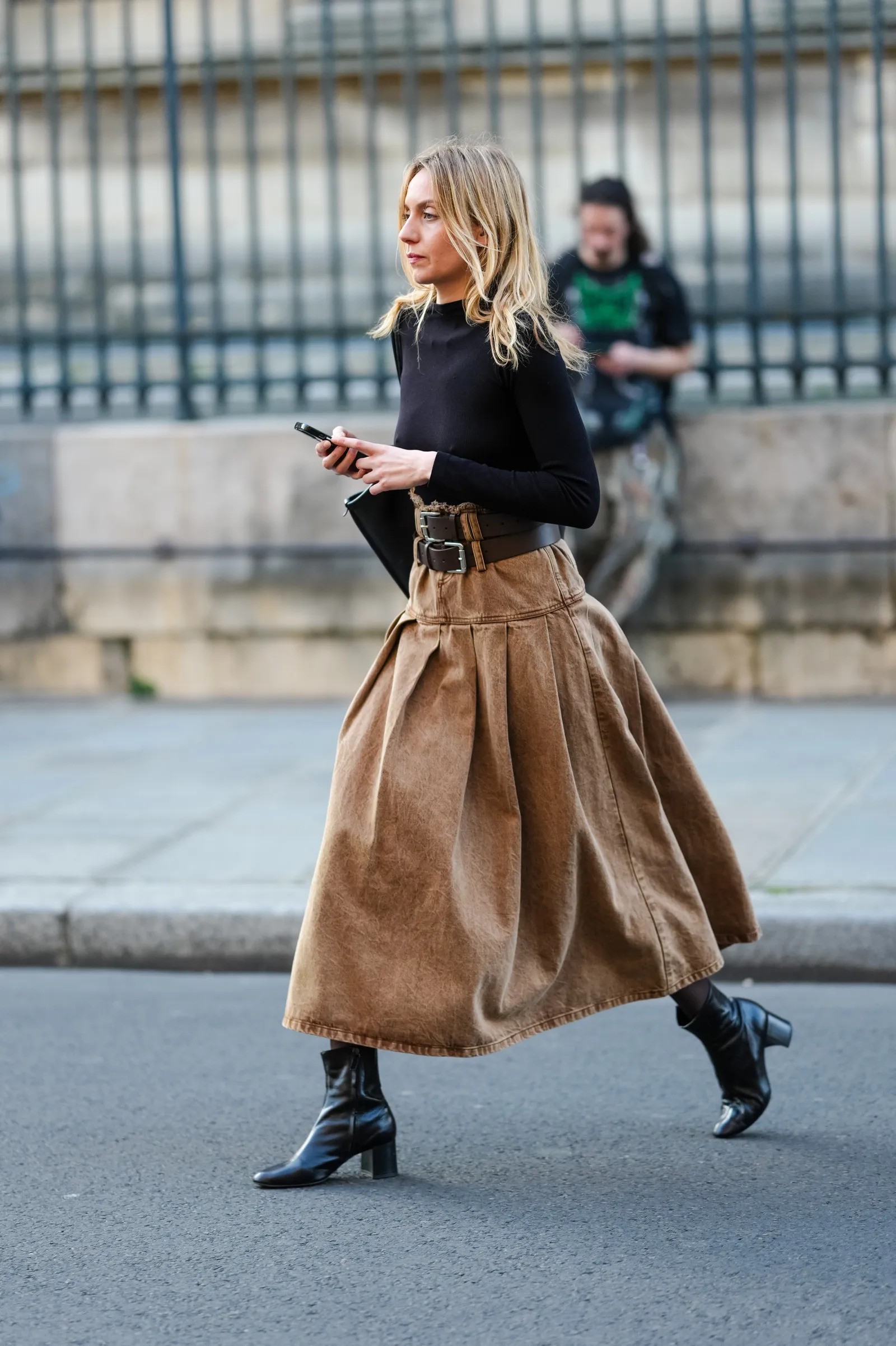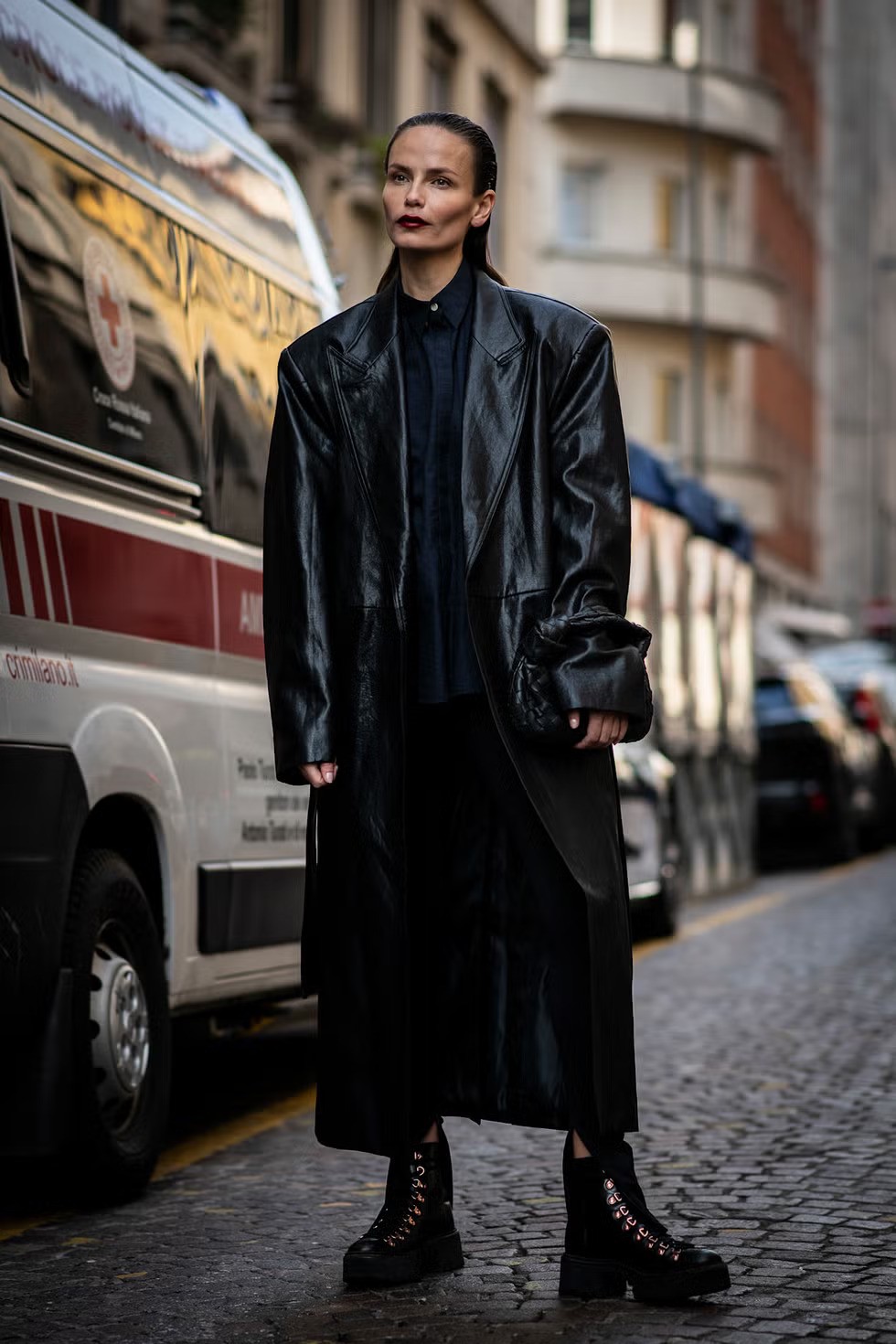 Cổ boots đứng, đường viền chắc chắn và phần đế có độ cao vừa phải mang lại cảm giác an tâm khi di chuyển, đặc biệt trong những ngày ẩm ướt. Khi kết hợp với váy midi mềm rũ, combat boots tạo nên đối lập rất đắt: sự cứng cáp của da và nét bay của chất liệu vải. Đi cùng quần da, chúng nhắc nhớ tinh thần nổi loạn vừa đủ; còn khi đi cùng jeans ôm và áo len oversize, combat boots trở thành điểm neo giúp tổng thể trang phục có chiều sâu và tính ổn định.