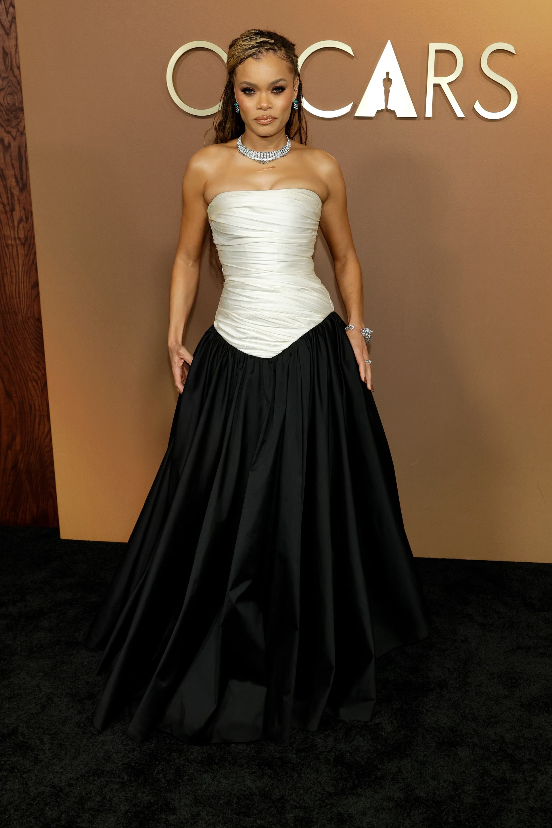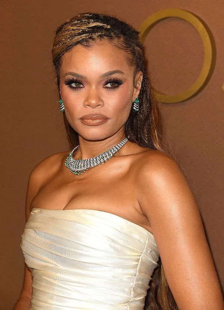 Nếu Elle là hiện thân sự thanh tú, thì Andra Day lại mang đến một khoảnh khắc thảm đỏ giàu cảm xúc hơn: Tràn đầy màu sắc và cấu trúc. Cô kết hợp nhiều thiết kế từ các bộ sưu tập khác nhau của Cartier: Đôi hoa tai Géométrie & Contrastes với sắc chrysoprase xanh lục, onyx đen và kim cương trắng; vòng cổ Le Voyage Recommencé với đá emerald; cùng vòng tay và nhẫn Panthère de Cartier - biểu tượng mãnh liệt nhất của thương hiệu.