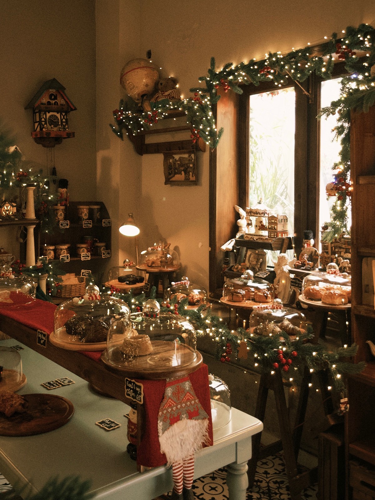 Quán có diện tích không lớn nhưng lại tạo được sự ấm áp nhờ cách bày trí chỉn chu. Bên trong không gian quán được trang trí cây thông lấp lánh, các mô hình bánh gừng nhỏ xinh và ánh đèn xanh ngọc hòa vào nhau tạo nên không khí lễ hội dịu dàng và gần gũi.