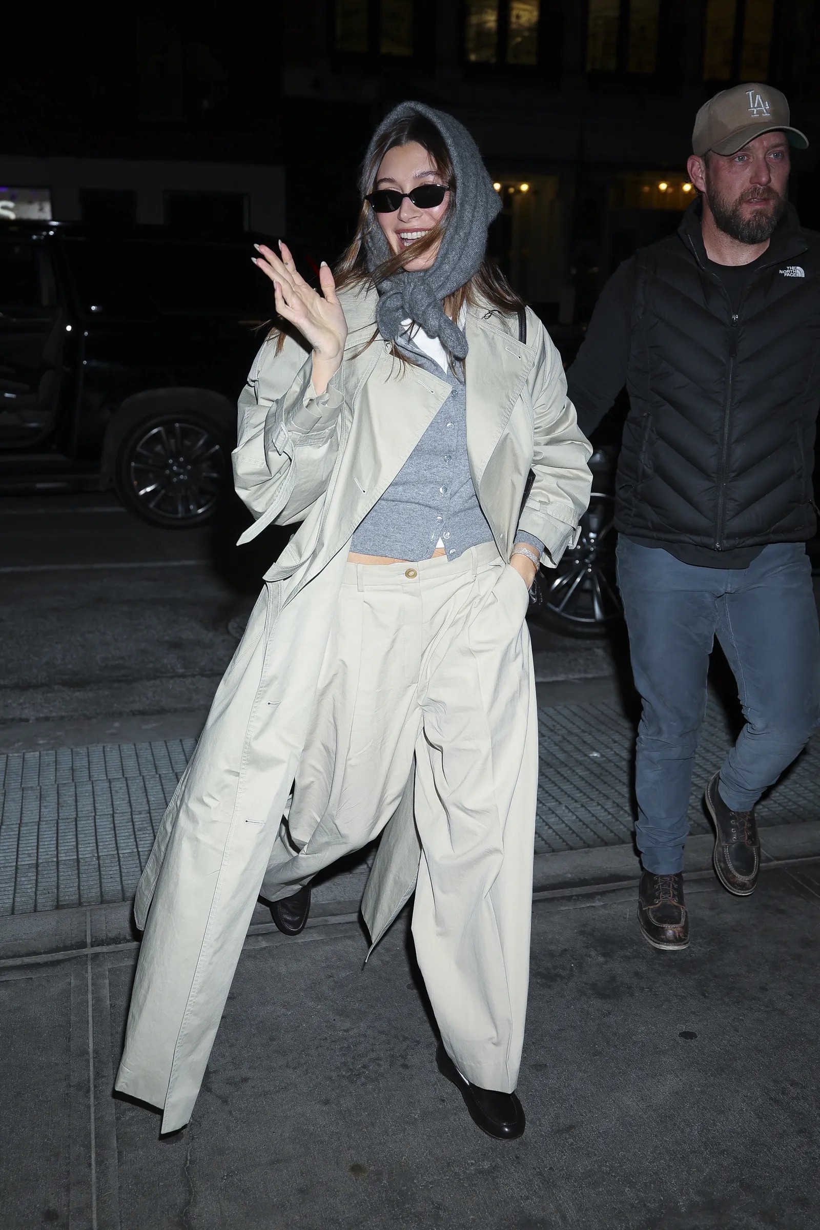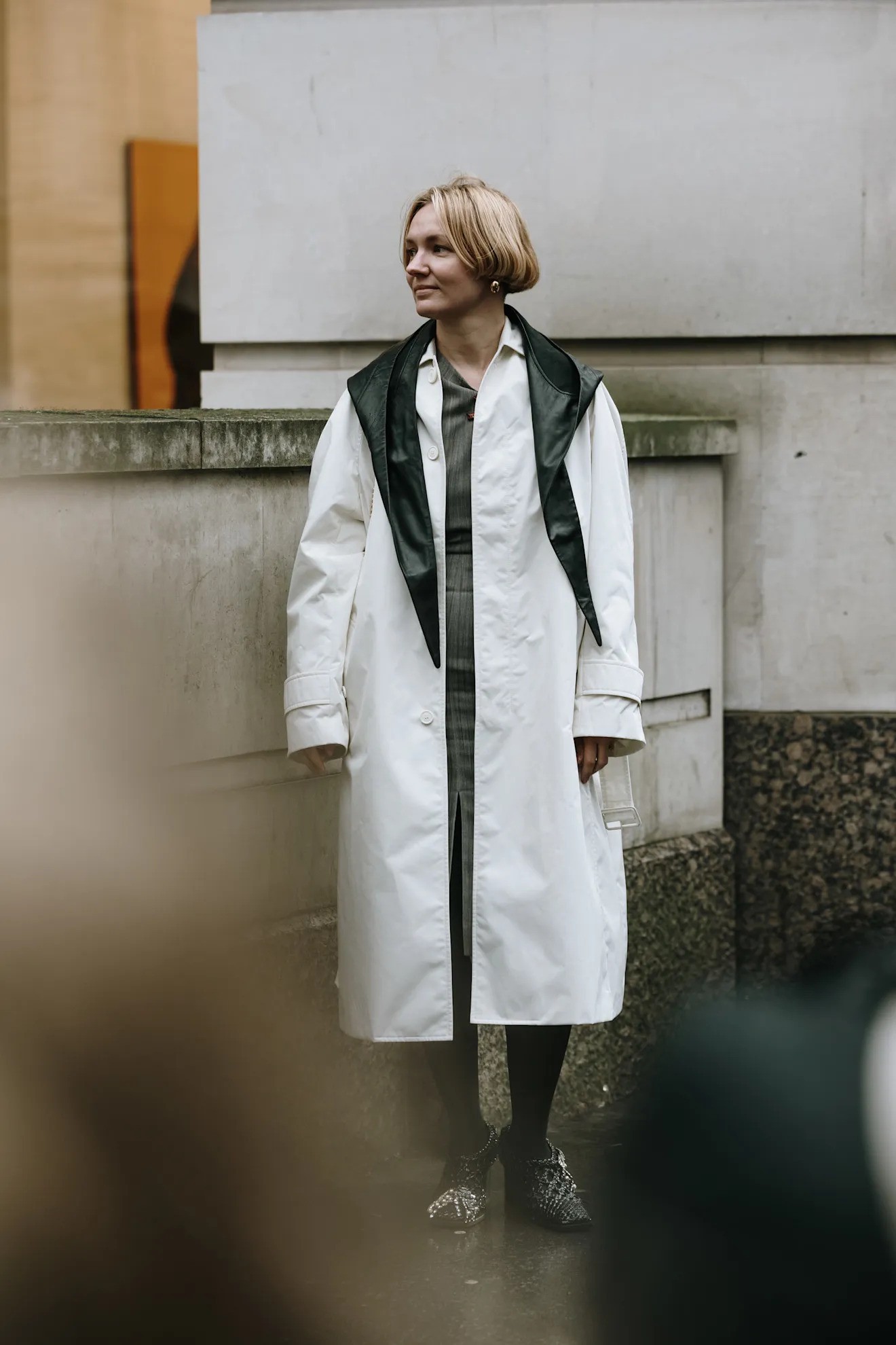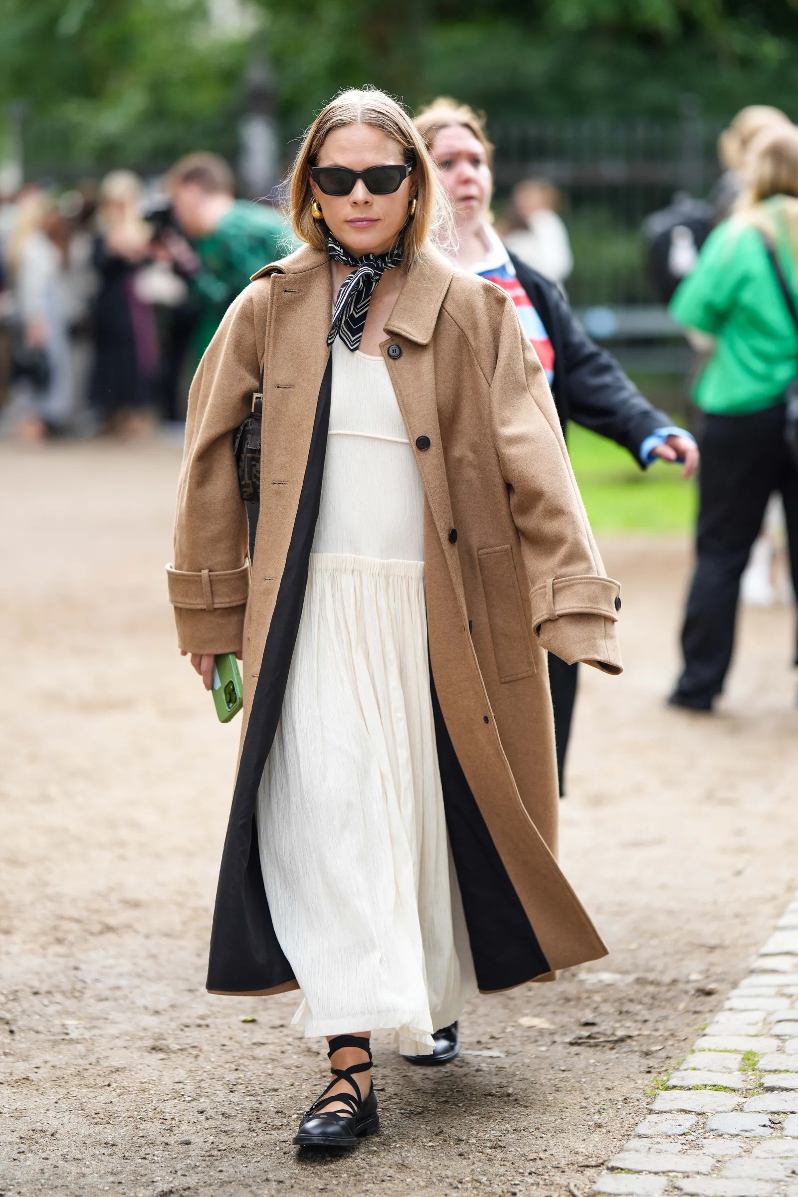 Với những chiếc khăn tam giác kích cỡ lớn hơn, người mặc có thể quàng hờ lên vai, giống một chiếc cape mỏng. Phần cạnh dài của khăn đặt ngang vai, hai đầu thả tự nhiên hoặc khéo léo dấu nhẹ phía sau để tạo cảm giác liền mạch. Khi đi cùng trench coat hoặc áo khoác dài, cách phối này trở thành lớp trung gian giữa áo khoác ngoài và layer bên trong, mang lại chiều sâu thị giác rất tinh tế. Đây là cách phối “tưởng như không cố” nhưng lại làm outfit sang lên thấy rõ.