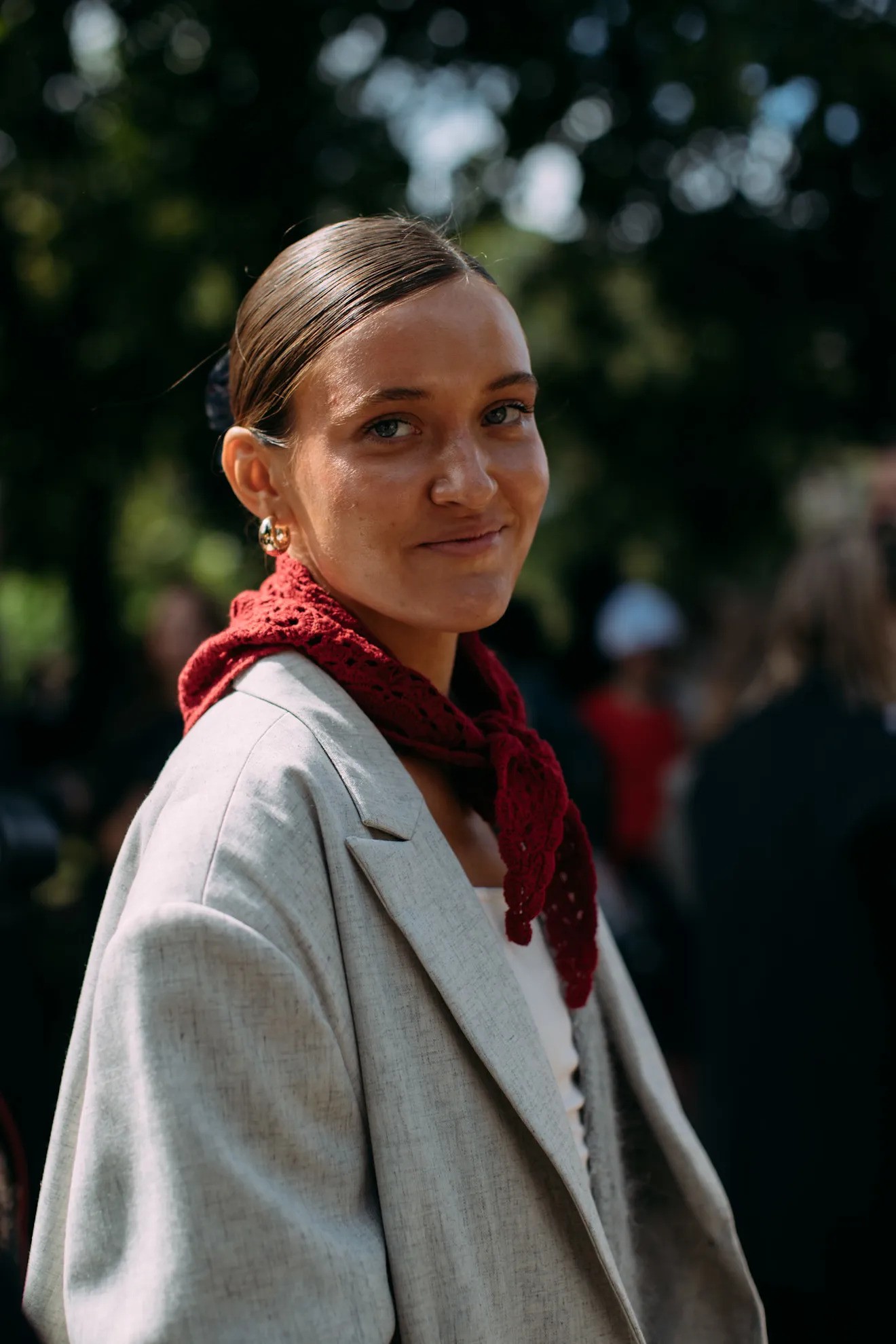 Trong vòng hai mùa trở lại đây, chiếc khăn tam giác, vốn từng gắn với hình ảnh khăn bandana mảnh mai của mùa hè, đang trỗi dậy thành món phụ kiện không thể thiếu của mùa lạnh 2025–2026. Thay vì những chiếc khăn choàng dày cộm, sự xuất hiện của khăn tam giác mang đến một cách xử lý cổ áo tinh tế hơn: Gọn nhẹ nhưng sắc nét, tối giản mà vẫn tạo hiệu ứng thị giác mạnh. Khi thời trang chuyển dịch về những món đồ nhỏ nhưng “đắt”, chiếc khăn tam giác trở thành điểm hoàn thiện cuối cùng, một cú nhấn cho mọi set đồ mùa đông.
