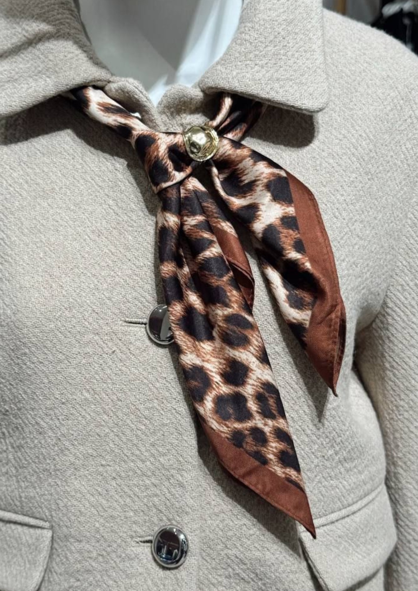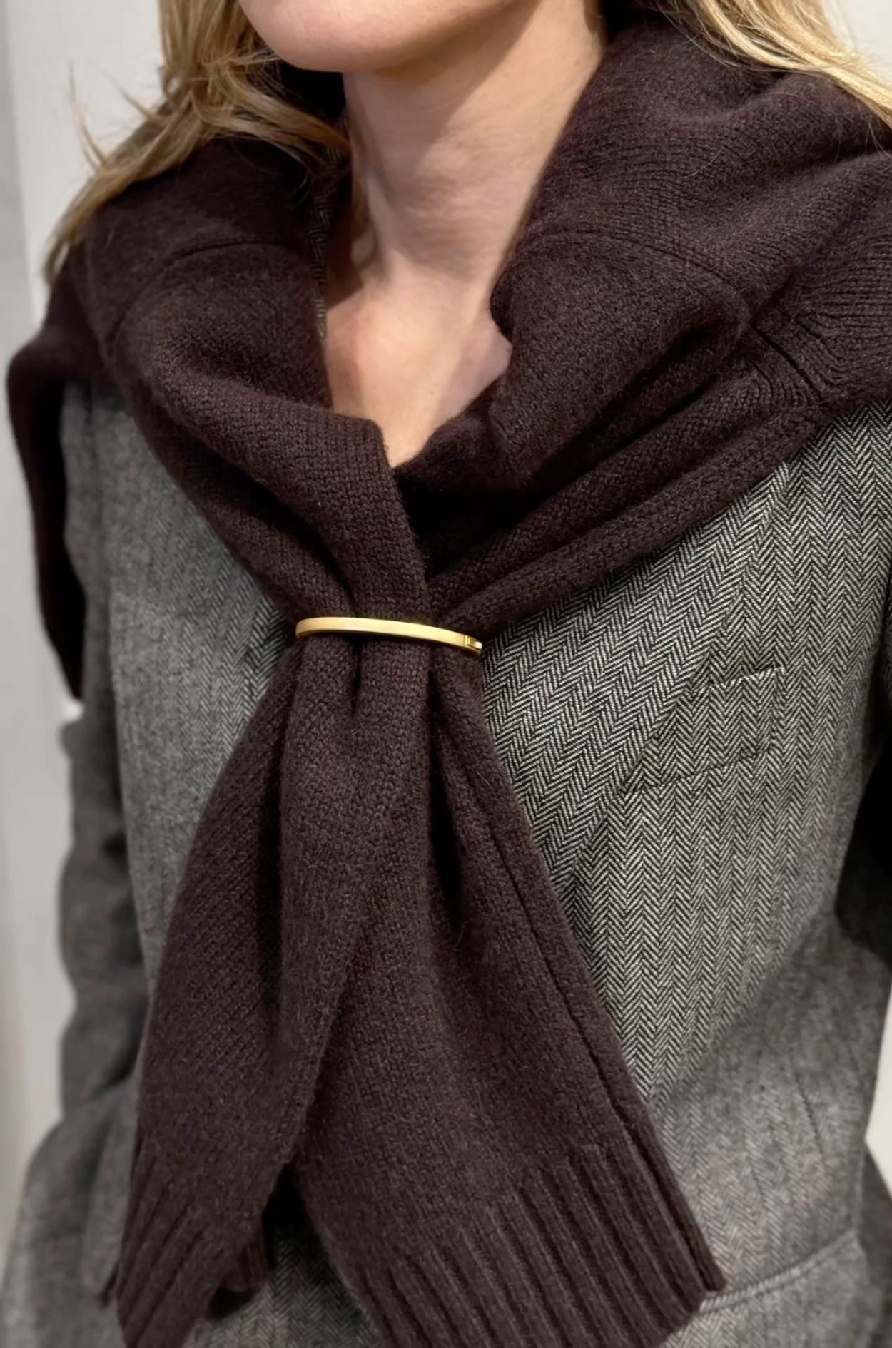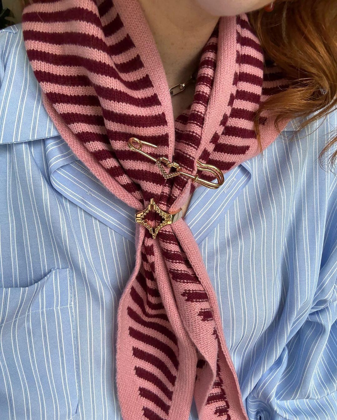 Một trong những cách mới mẻ nhất để làm nổi bật chiếc khăn len mùa lạnh chính là cố định nó bằng brooch hoặc khoen cài kim loại. Chỉ cần quàng khăn hờ quanh cổ hoặc vai, sau đó dùng một chiếc brooch vàng nhỏ để ghim hai lớp khăn lại với nhau, tổng thể lập tức trở nên sang trọng và có chủ đích hơn. Cách cài này không chỉ giữ khăn đúng vị trí mà còn tạo nên hiệu ứng “điêu khắc” ở phần ngực và vai: mềm từ chất liệu len, nhưng sắc nét từ ánh kim loại. Kiểu cài này đặc biệt phù hợp với áo khoác dạ hoặc suit dáng rộng, nơi chiếc brooch sẽ đóng vai trò như điểm sáng trang sức nhưng không hề phô trương.