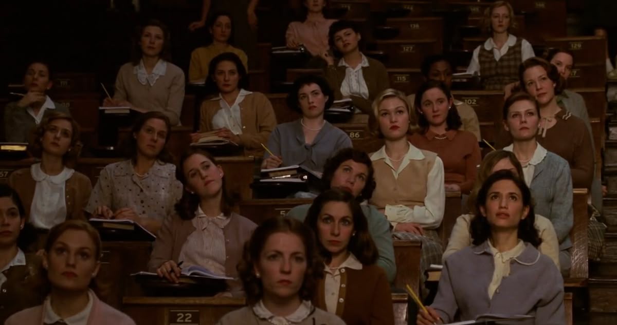 Một mặt, Wellesley quả thực mang đến những cơ hội học tập vượt trội. Nữ sinh được mài giũa trí tuệ qua các môn học cao cấp như văn chương, khoa học, ngôn ngữ và đặc biệt là lịch sử nghệ thuật. Điều này được thể hiện rõ qua lời tuyên thệ ở đầu phim, phản ánh lý tưởng của nhà trường: “Tôi chỉ là một phụ nữ bình thường. Hãy đánh thức linh hồn tôi bằng cách chăm chỉ học tập và dâng hiến cuộc đời cho kiến thức”. Người xem và cả nhân vật chính đã từng tin rằng Wellesley là nơi tri thức được tôn vinh như con đường khai mở tâm hồn.
