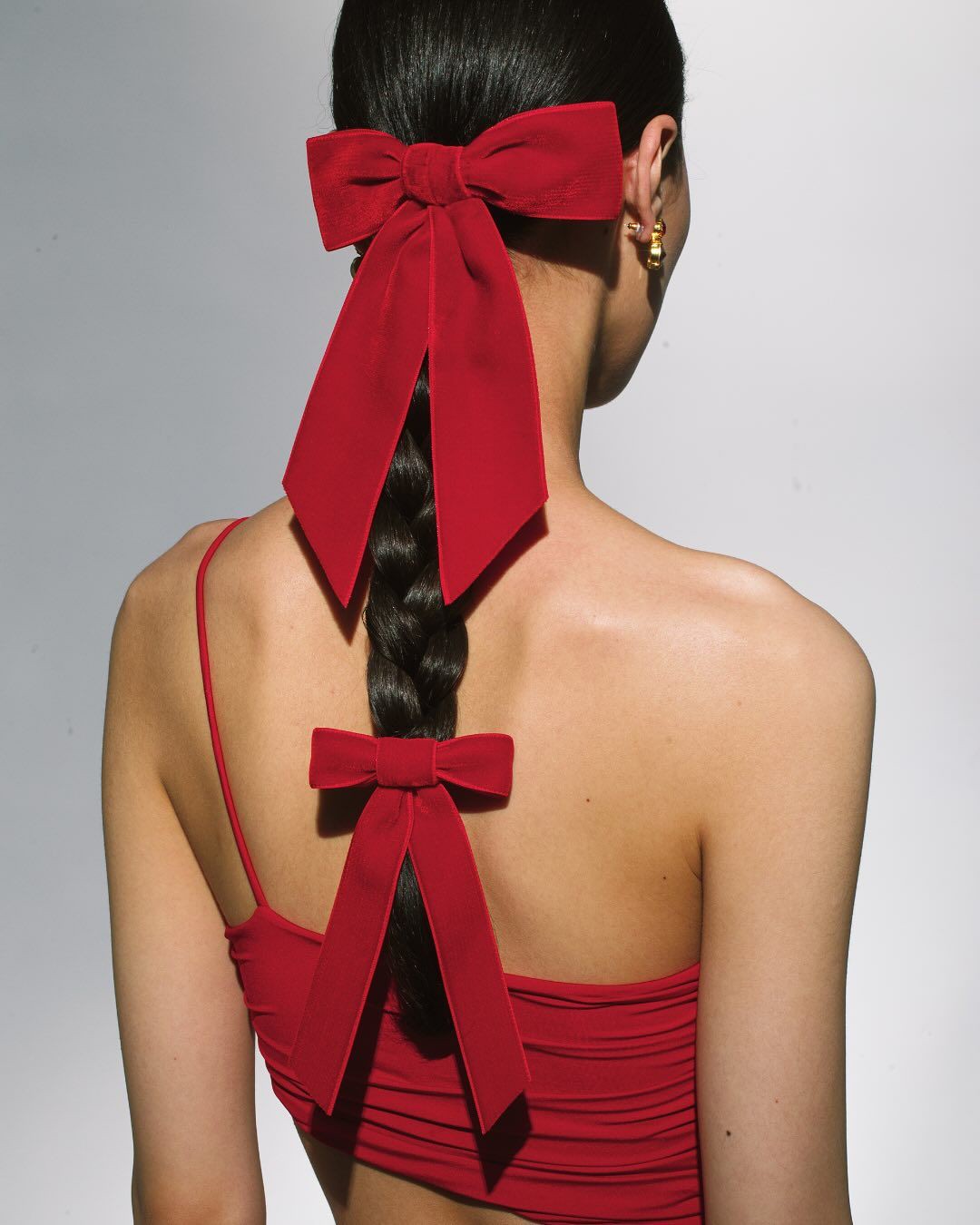 Nơ nhung bản lớn là một trong những phụ kiện tóc mang tính biểu tượng nhất của mùa Giáng sinh năm nay, không chỉ vì vẻ mềm mại của chất liệu mà còn ở cách nó định hình thái độ cho người đội. Nhung có độ rơi tự nhiên, tạo bóng và giữ form tốt, vì vậy khi đặt lên tóc, đặc biệt là tóc nửa buộc hoặc đuôi ngựa phồng, sẽ phát huy tối đa sự mềm mại. Màu nhung đen hoặc đỏ rượu vang gợi cảm giác cổ điển theo kiểu Paris hay các cô gái học thuật Ivy League. Khi đặt nơ cao hơn bình thường, phần đuôi nơ rủ xuống sẽ giúp kéo dài phần cổ và lưng, cho cảm giác tỷ lệ cơ thể thanh thoát hơn.