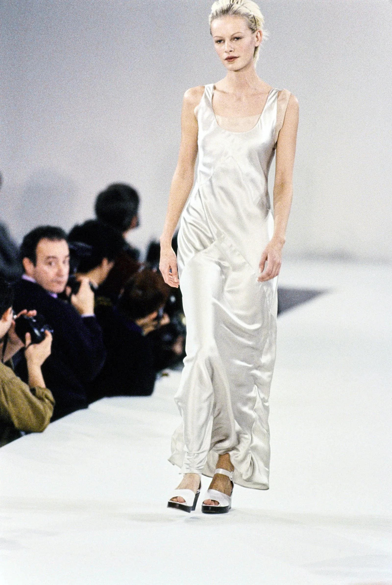 Không lâu sau, Carolyn Bessette-Kennedy – trong chiếc váy cưới satin tinh khiết của Narciso Rodriguez – viết lại định nghĩa về thanh lịch. Không ren, không nơ, không tầng lớp. Chỉ là đường cắt bias ôm lấy cơ thể, để ánh sáng tự tìm cách đi qua. Khi cô bước đi, cả thế giới hiểu rằng sự tối giản không phải là sự thiếu vắng, mà là quyền năng biết dừng lại ở vừa đủ.