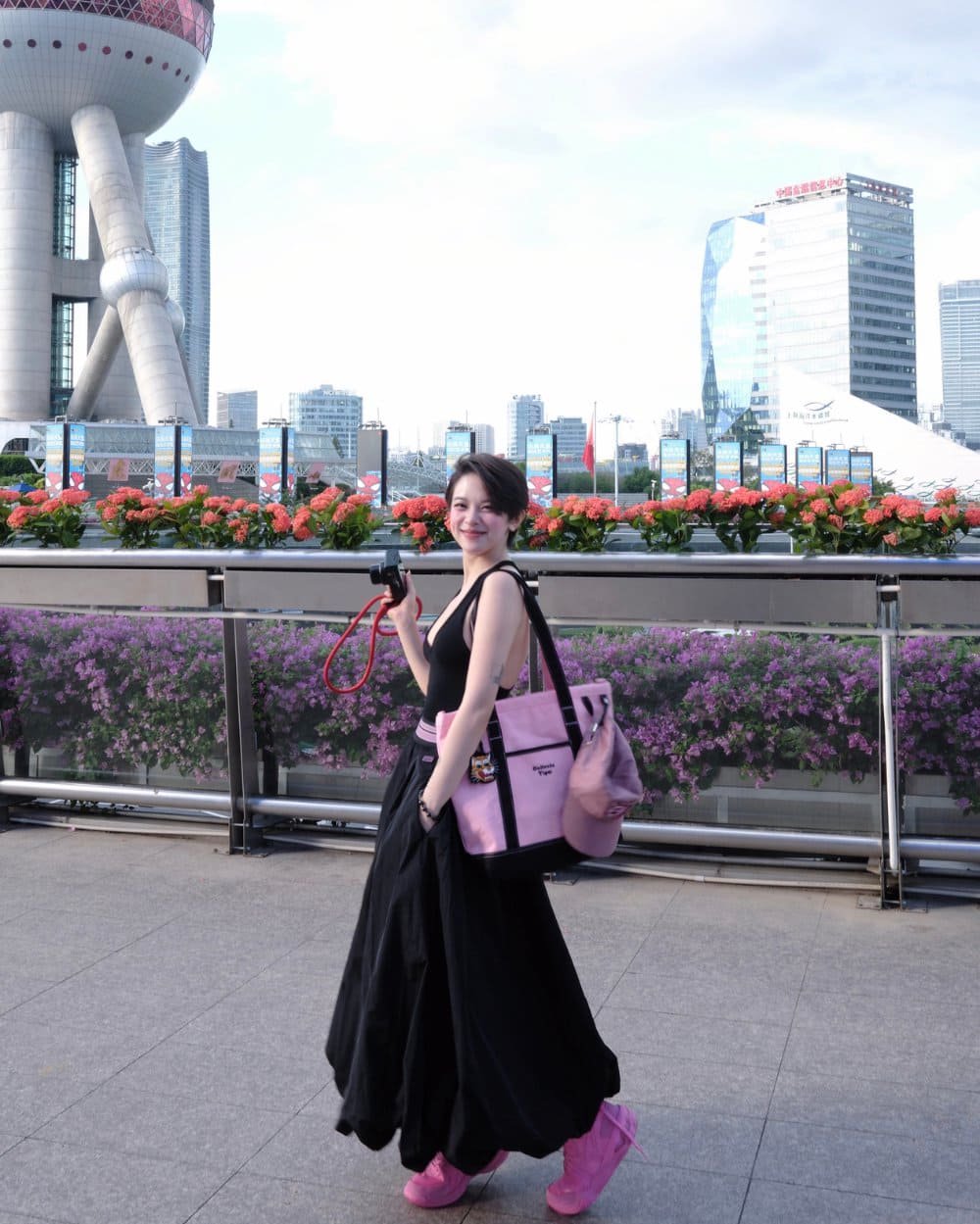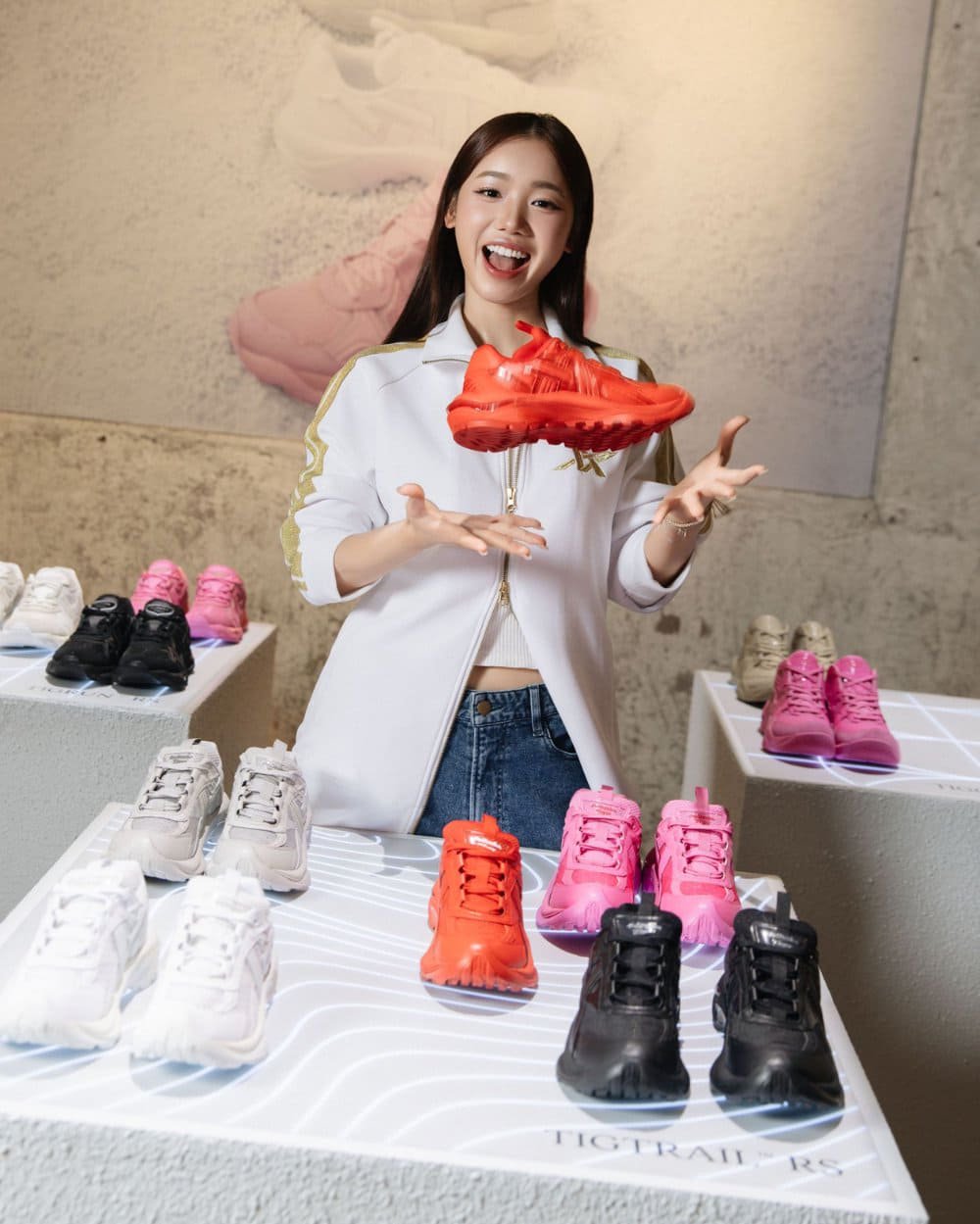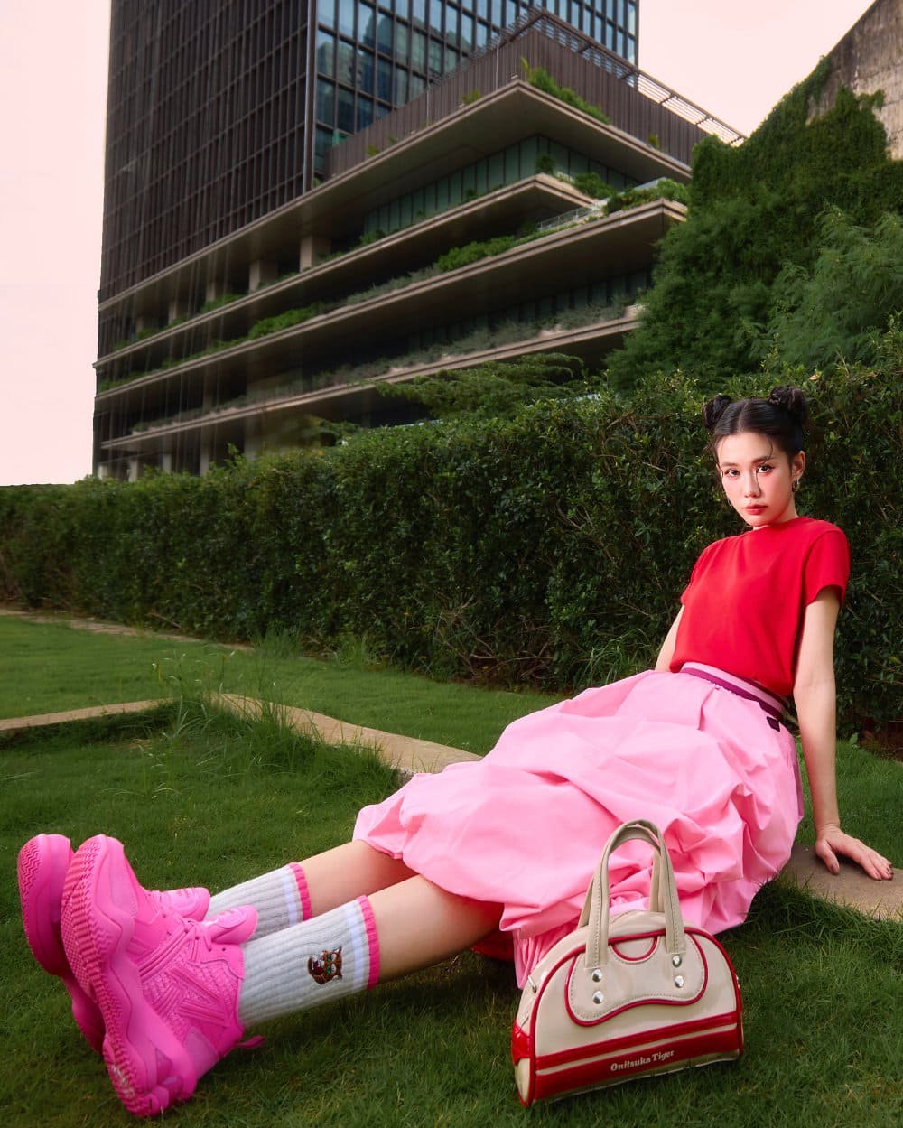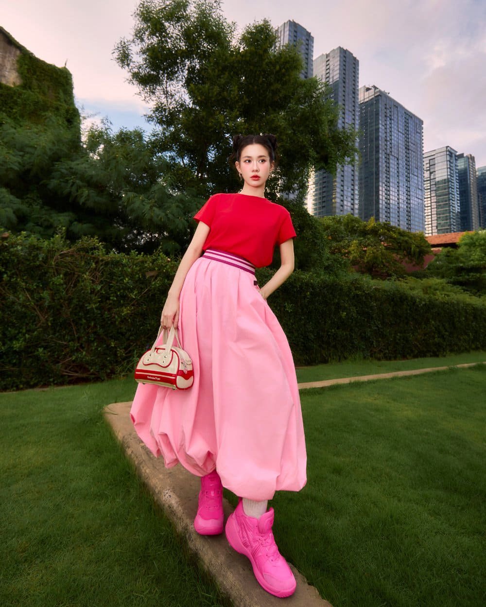 Ngọc Thảo chọn bản phối hồng–đỏ rực rỡ giữa mảng xanh thành phố: tươi trẻ, ngọt ngào nhưng chẳng hề dễ đoán. Đôi sneaker hồng biến cô thành biểu tượng của sự nổi loạn dịu dàng – nơi nữ tính và năng lượng cùng tồn tại.