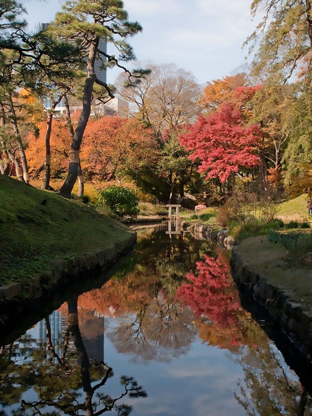 Vào thu, từng lối đi quanh hồ nước trong veo phủ đầy sắc đỏ của lá phong. Dưới những tán cây, những chiếc ghế gỗ nằm lặng lẽ chờ người ngồi xuống nhấm nháp ly trà nóng và lắng nghe tiếng lá chạm nhau trong gió. Đứng giữa Shinjuku Gyoen, bạn sẽ quên mất bản thân đang hiện diện giữa thủ đô náo nhiệt mà thay vào đó là một miền quê thanh bình.