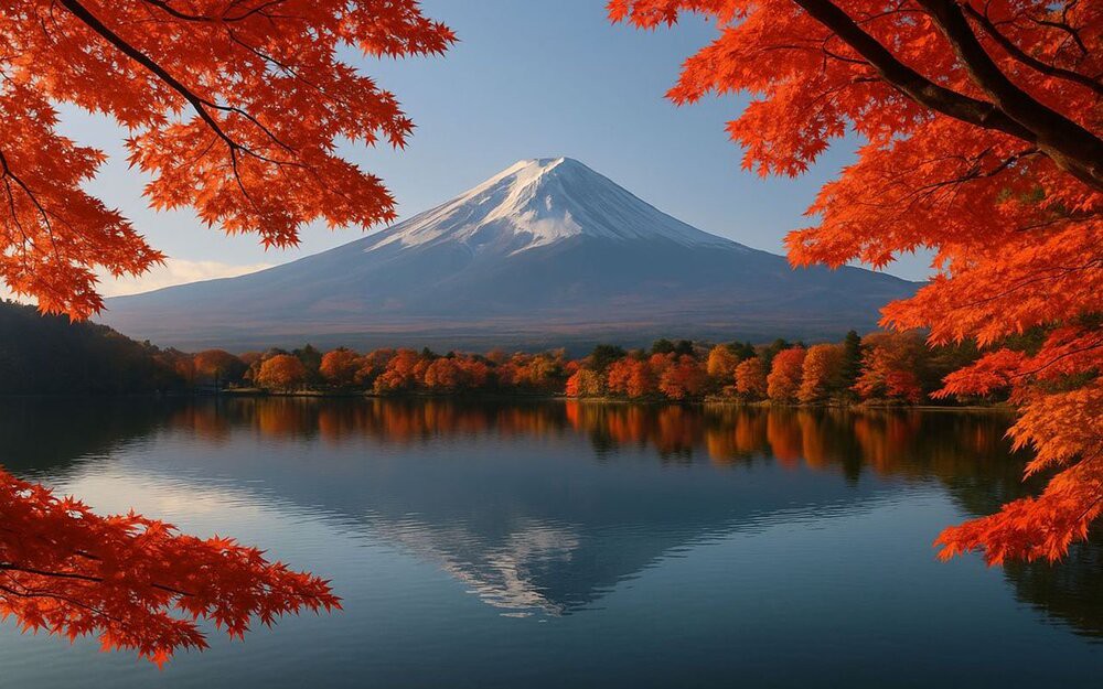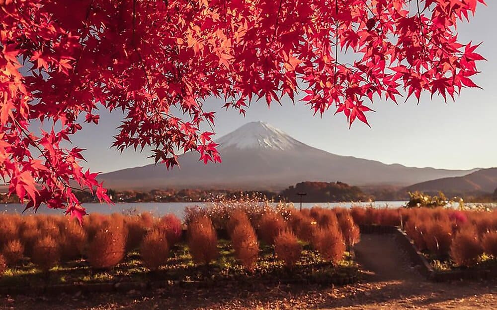 Nhắc đến Nhật Bản, khó ai quên hình ảnh ngọn núi Phú Sĩ soi bóng xuống mặt nước phẳng lặng của hồ Kawaguchi. Vào thu, khung cảnh ấy càng trở nên mê hoặc khi sắc đỏ lá phong ôm trọn lấy mặt hồ.