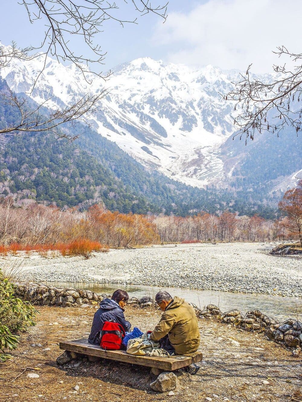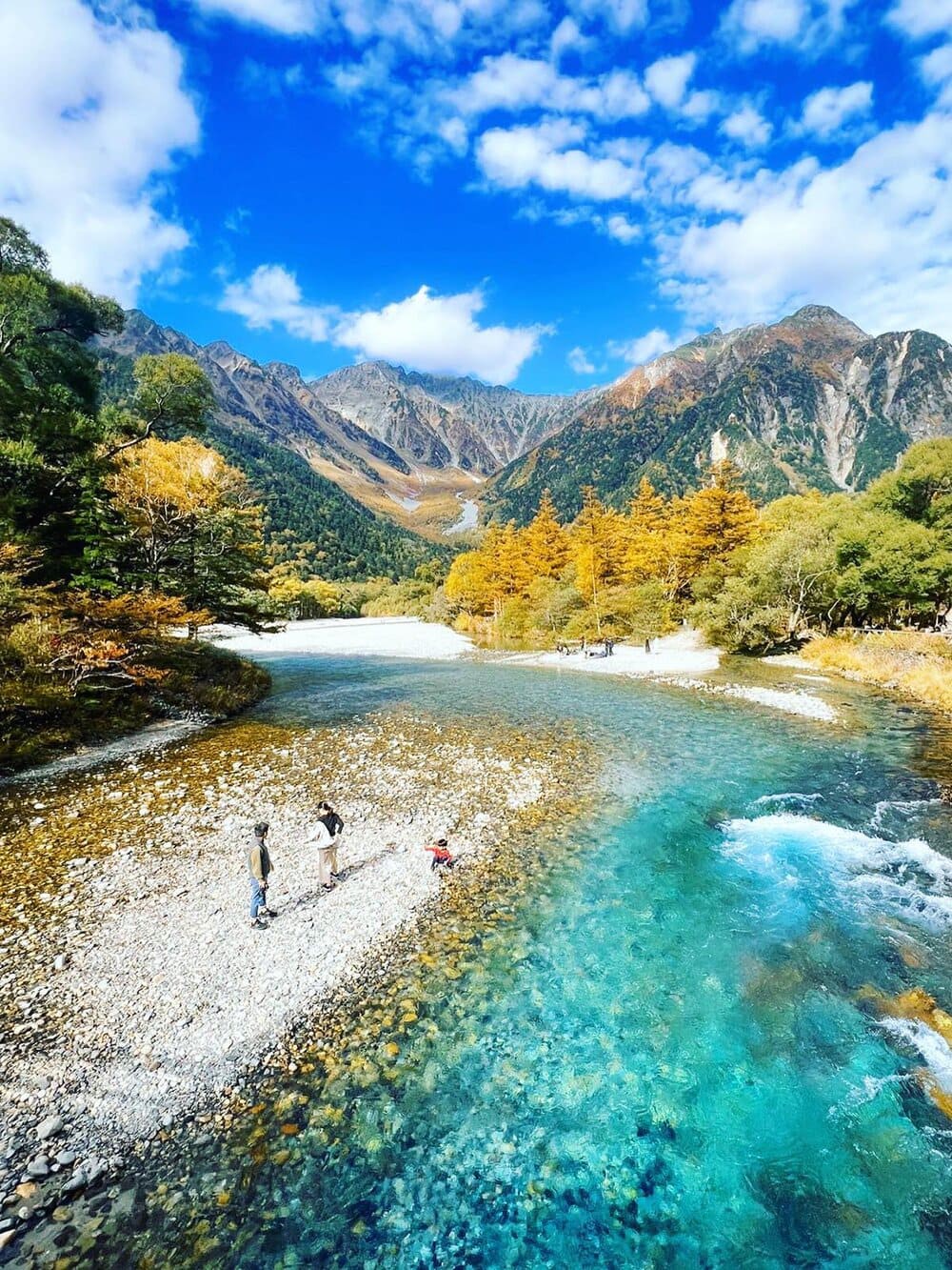 Cuối tháng 9, khi lá phong bắt đầu chuyển sắc, cả thung lũng như chìm trong sắc vàng cam rực rỡ. Cầu gỗ Kappa, biểu tượng của Kamikochi, trở thành điểm dừng chân để lữ khách ngắm nhìn dòng sông phản chiếu những hàng liễu vàng mọc dọc hai bên bờ.