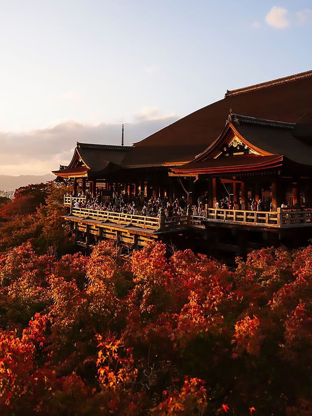 Khi thu về, từ ban công gỗ vươn ra giữa rừng, bạn có thể nhìn thấy cả Kyoto chìm trong biển lá đỏ. Ánh nắng xuyên qua tầng lá, rơi trên mái chùa rêu phong, khẽ chạm vào những bậc gỗ đã nhẵn dấu chân người hành hương. Giữa hương trầm lan tỏa, người ta chợt thấy thời gian ngưng đọng, và trong tâm hồn chỉ còn tồn tại sự thanh khiết.