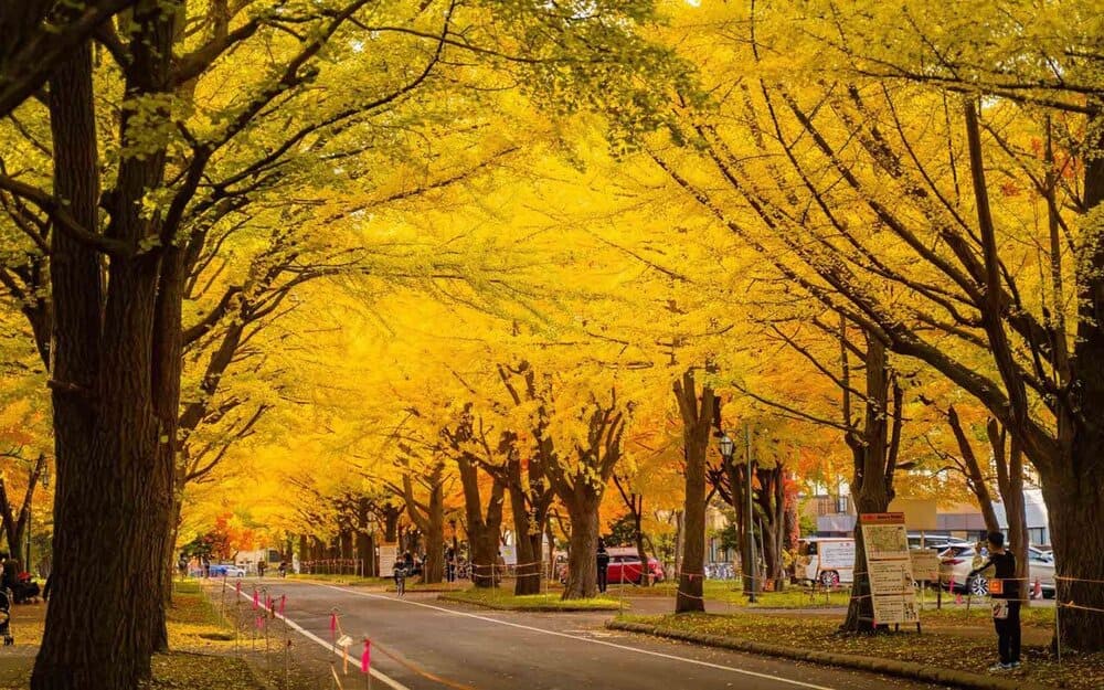 Được thành lập từ năm 1876, ngôi trường Đại học Hokkaido danh tiếng là điểm đến thu hút mỗi khi thu về. Từ cuối tháng 10, khoảng 70 cây thủy tùng đồng loạt chuyển sang sắc vàng rực rỡ trên con đường dài gần 400m, tạo nên khung cảnh điện ảnh khó lòng cường được.