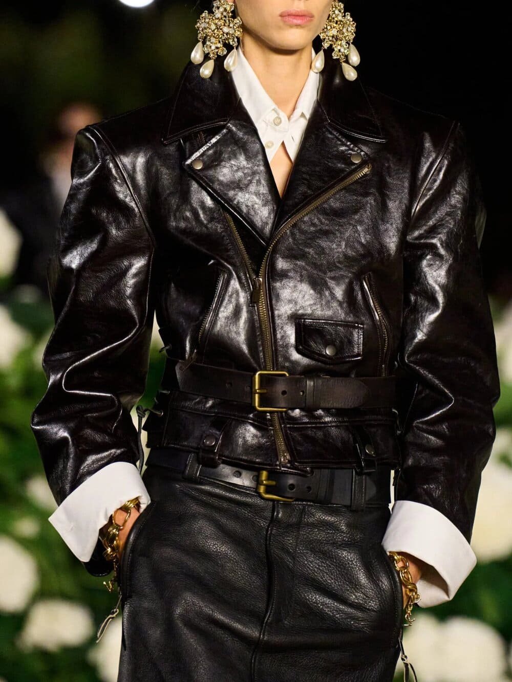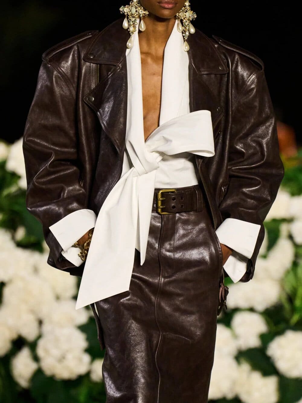 Ở Saint Laurent SS26, Anthony Vaccarello tiếp tục hành trình giải mã quyền lực nữ tính: những chiếc trench coat mỏng như sương phủ lên làn da trần, vừa che vừa phơi bày. Song song đó, chất liệu da được tôn vinh hết cỡ để khắc họa sự đối lập giữa hai hình ảnh nữ tính và mạnh mẽ của người phụ nữ.