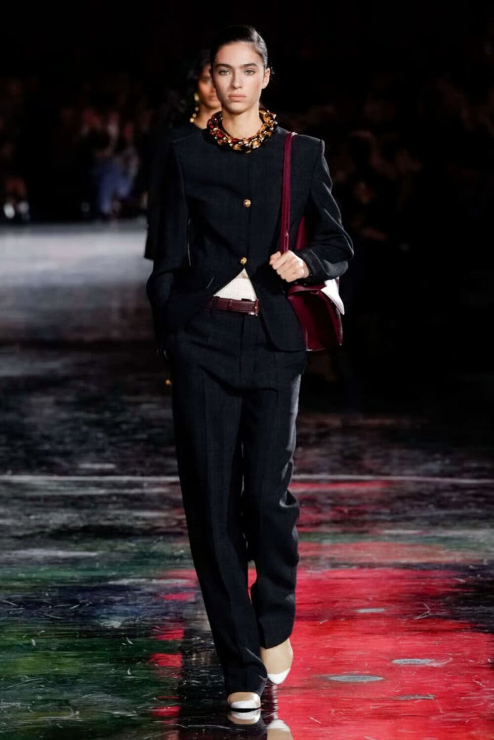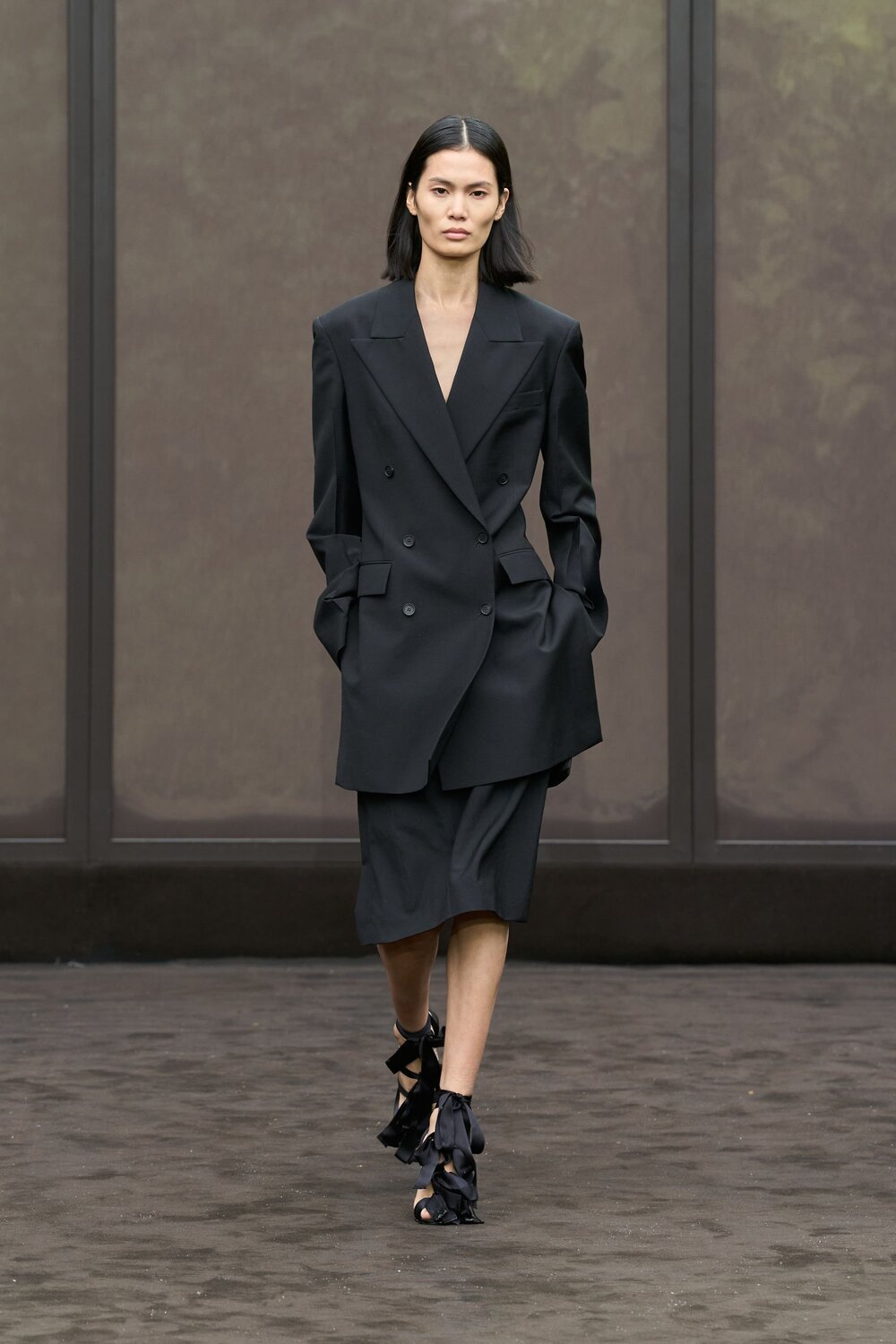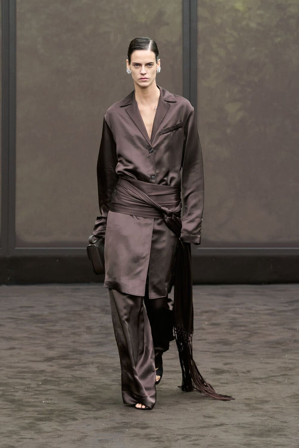 Bottega Veneta dưới thời Louise Trotter lại viết một chương mới cho tailoring bằng những chiếc vest phom rộng, vai xuôi, đi cùng quần suông và áo sơ mi buông lơi. Không còn kiểu suit “perfectly fitted” mang tinh thần quyền lực phô trương; thay vào đó là vest oversized, hơi lệch, có khi buộc áo len ngang vai, đi kèm giày đế mềm — quyền lực nằm ở độ rũ, ở bước đi nhẹ mà chắc, ở cách vest phản chiếu ánh sáng tự nhiên chứ không phải ánh đèn sân khấu.